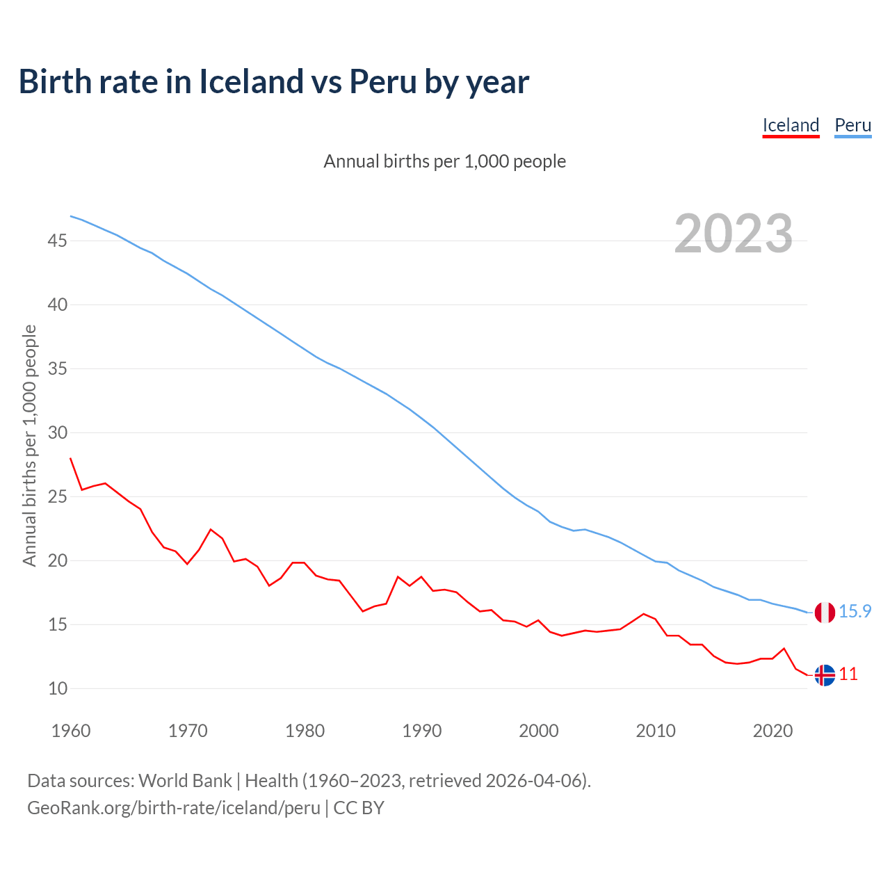 Iceland has an annual birth rate of 11 births per 1,000 people, compared to 15.9 for Peru. The average number of children a woman is expected to have during her lifetime — the fertility rate, is 1.59 in Iceland and 1.98 in Peru — 24.5% difference.