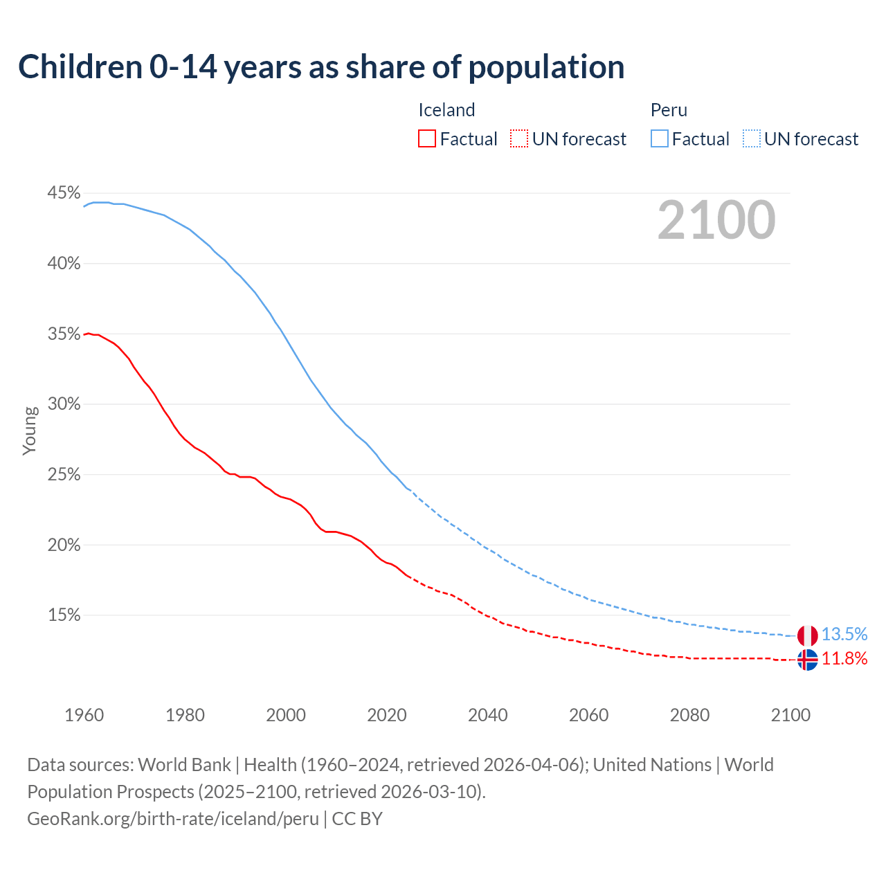 According to the latest available data on birth rates, the fertility rate in Iceland was 1.59 children per woman in 2023, compared to 1.98 in Peru in 2023. The replacement level is considered to be 2.1 children per woman.