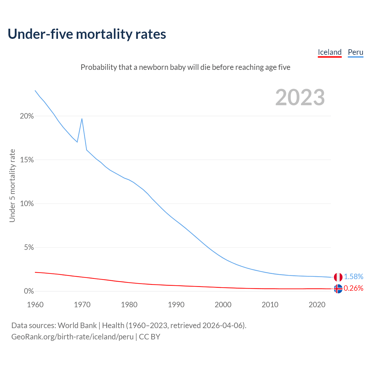 The chance that a newborn baby will die before reaching age five is 0.26% in Iceland and 1.58% in Peru. Above is a chart with historical data on under-five mortality rates.