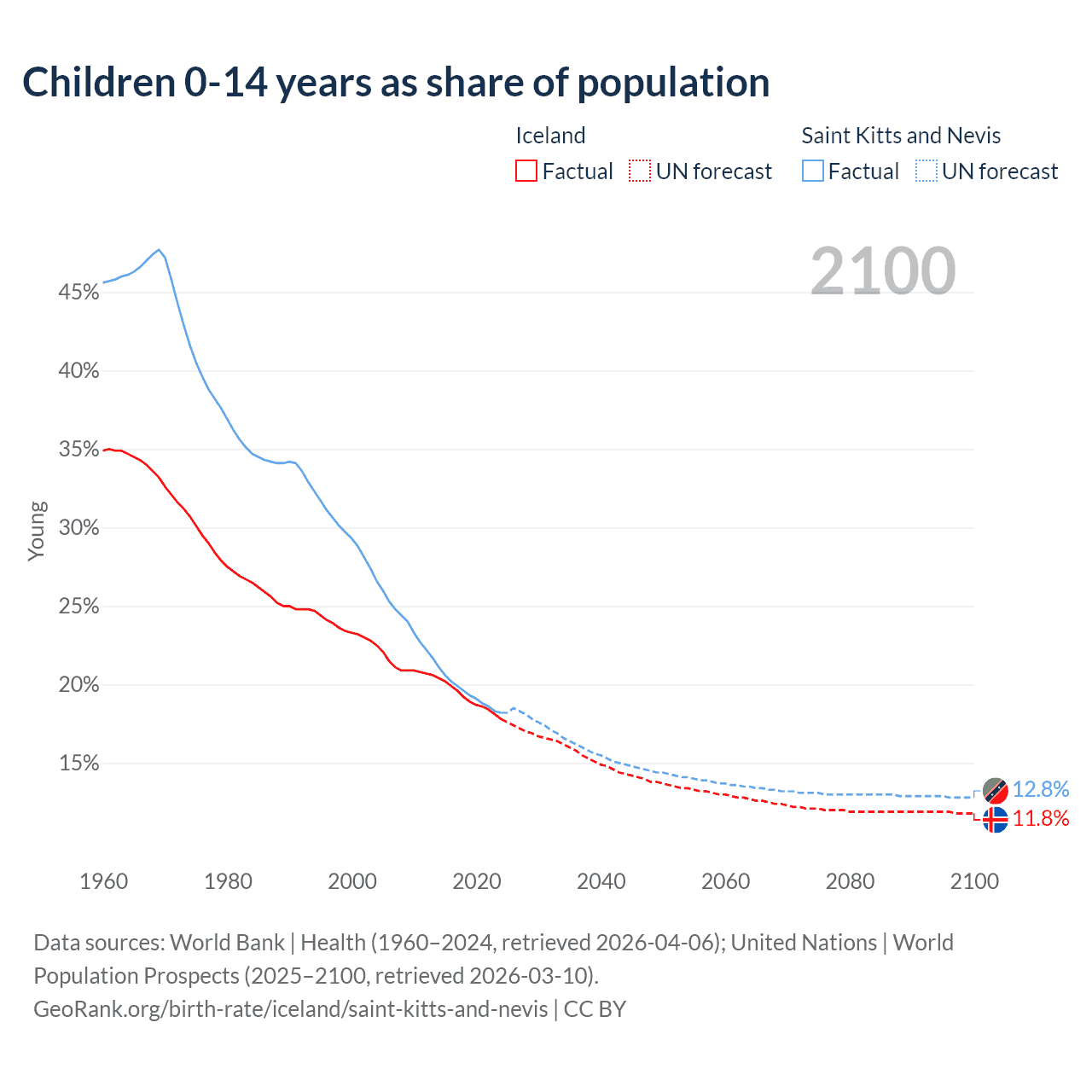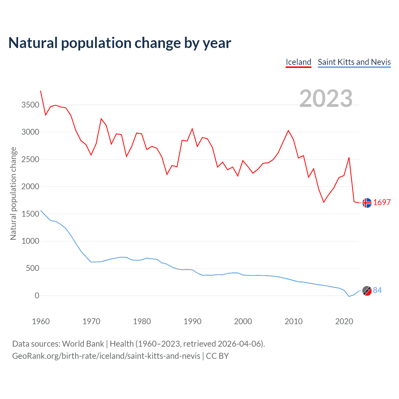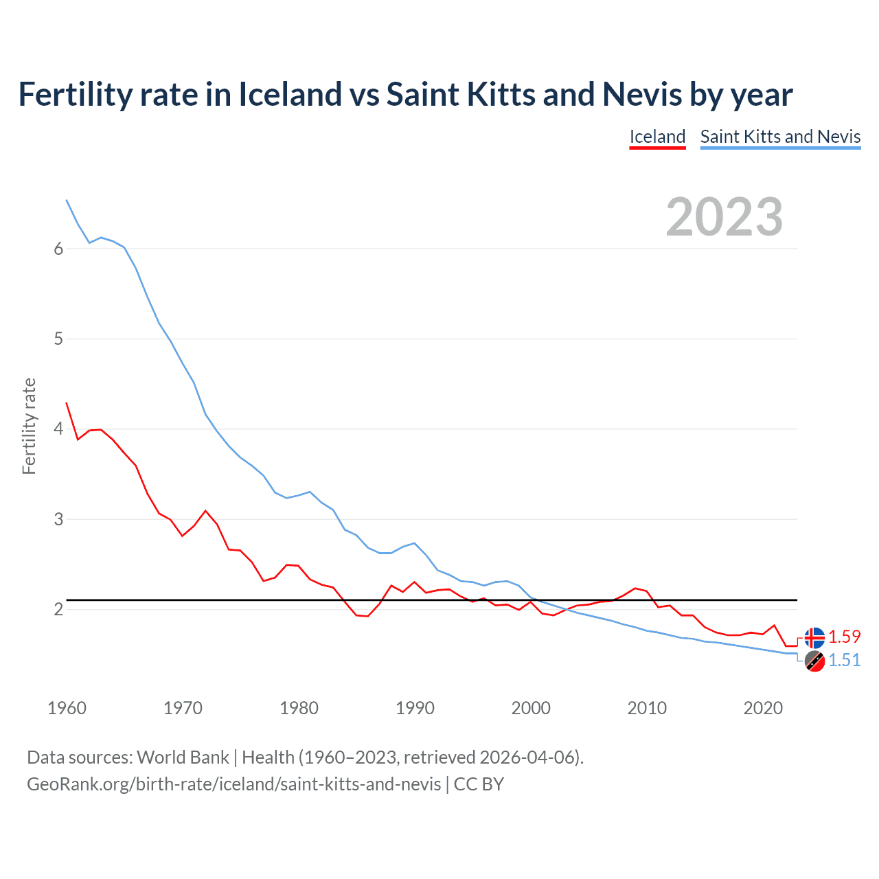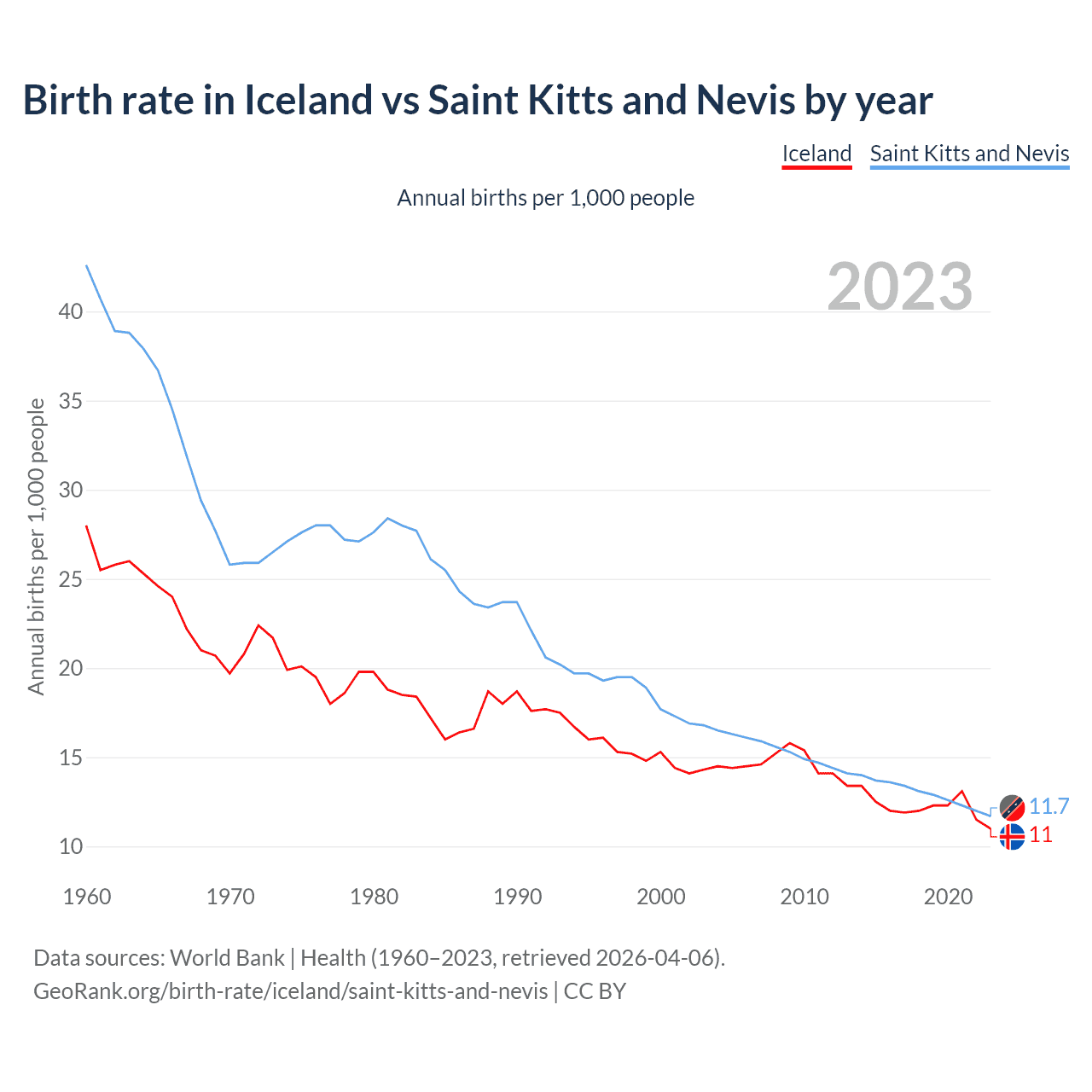 Iceland has an annual birth rate of 11 births per 1,000 people, compared to 11.7 for Saint Kitts and Nevis. The average number of children a woman is expected to have during her lifetime — the fertility rate, is 1.59 in Iceland and 1.51 in Saint Kitts and Nevis — 5.35% difference.