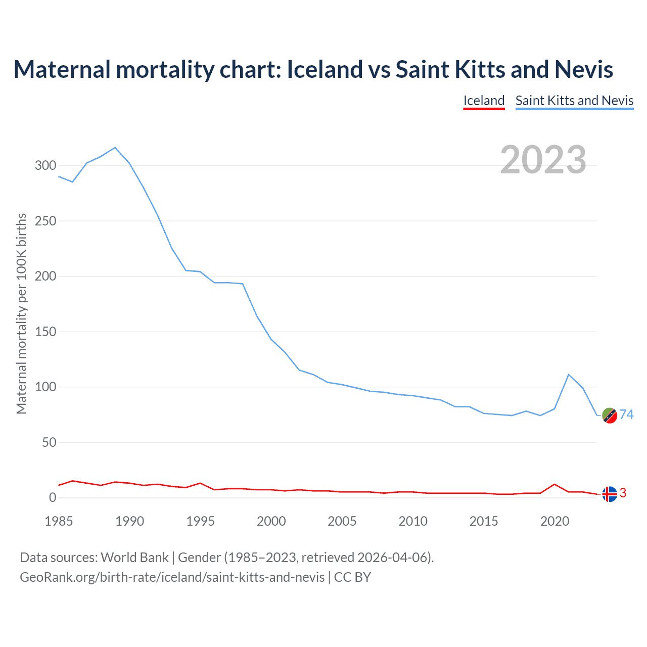 The maternal mortality rate, which is the probability of dying during childbirth or within 42 days of pregnancy termination, is 3 deaths per 100,000 live births in Iceland, compared to 74 deaths in Saint Kitts and Nevis.