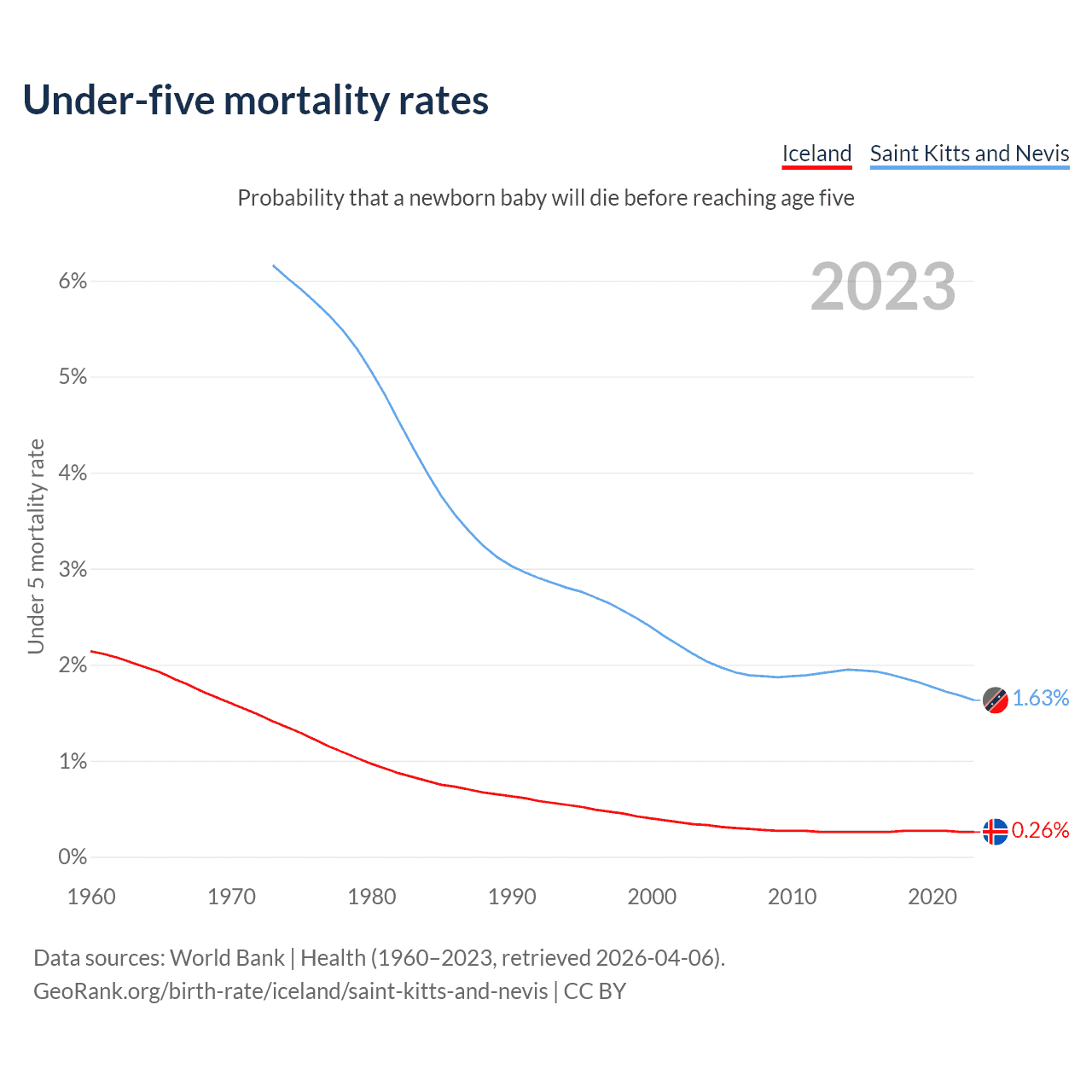 The chance that a newborn baby will die before reaching age five is 0.26% in Iceland and 1.63% in Saint Kitts and Nevis. Above is a chart with historical data on under-five mortality rates.
