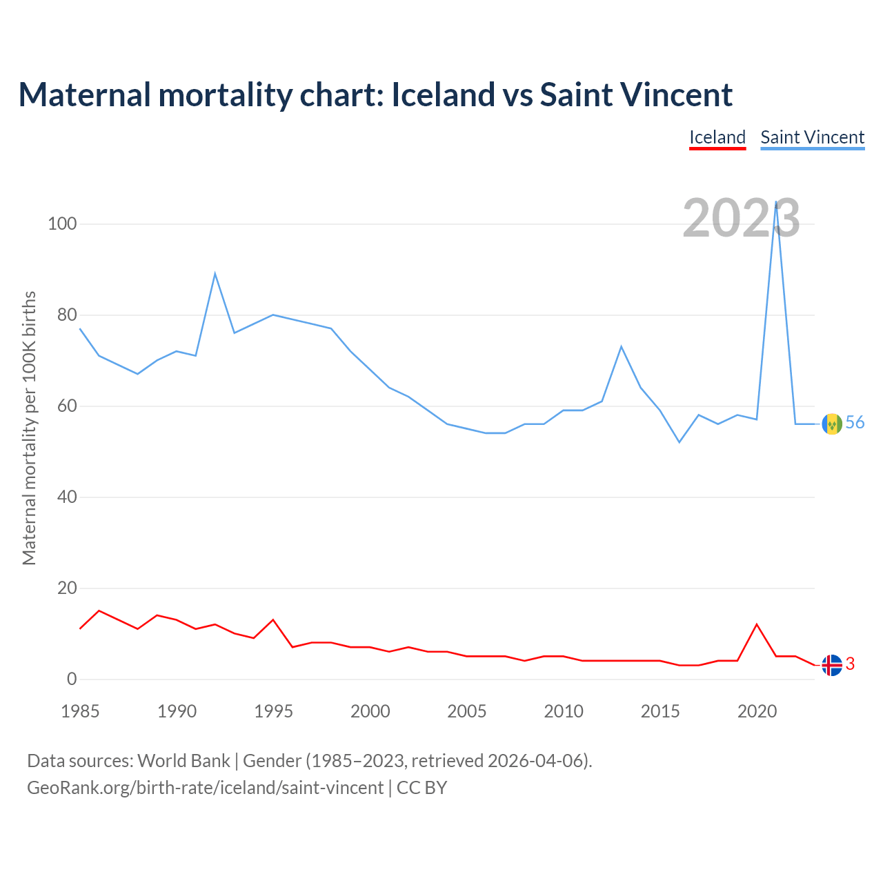 The maternal mortality rate, which is the probability of dying during childbirth or within 42 days of pregnancy termination, is 3 deaths per 100,000 live births in Iceland, compared to 56 deaths in Saint Vincent.