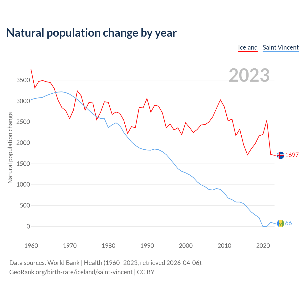 Iceland has an annual birth rate of 11 births per 1,000 people, compared to 12.2 for Saint Vincent. The average number of children a woman is expected to have during her lifetime — the fertility rate, is 1.59 in Iceland and 1.78 in Saint Vincent — 11.6% difference.