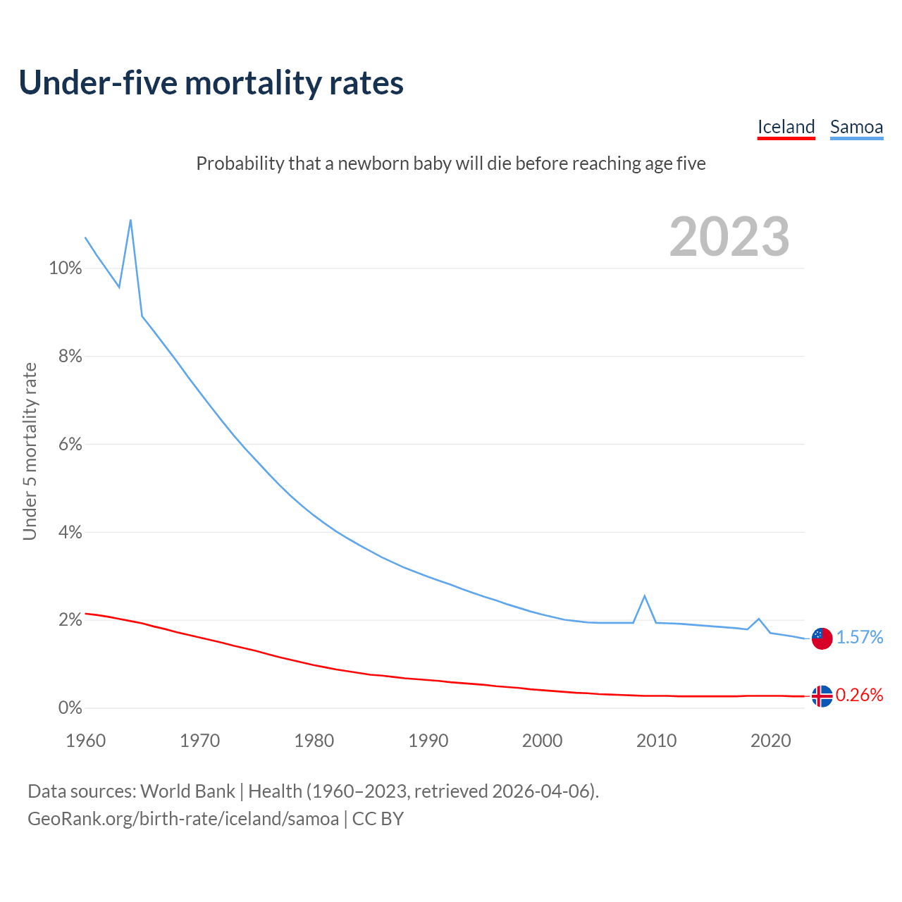 The chance that a newborn baby will die before reaching age five is 0.26% in Iceland and 1.57% in Samoa. Above is a chart with historical data on under-five mortality rates.