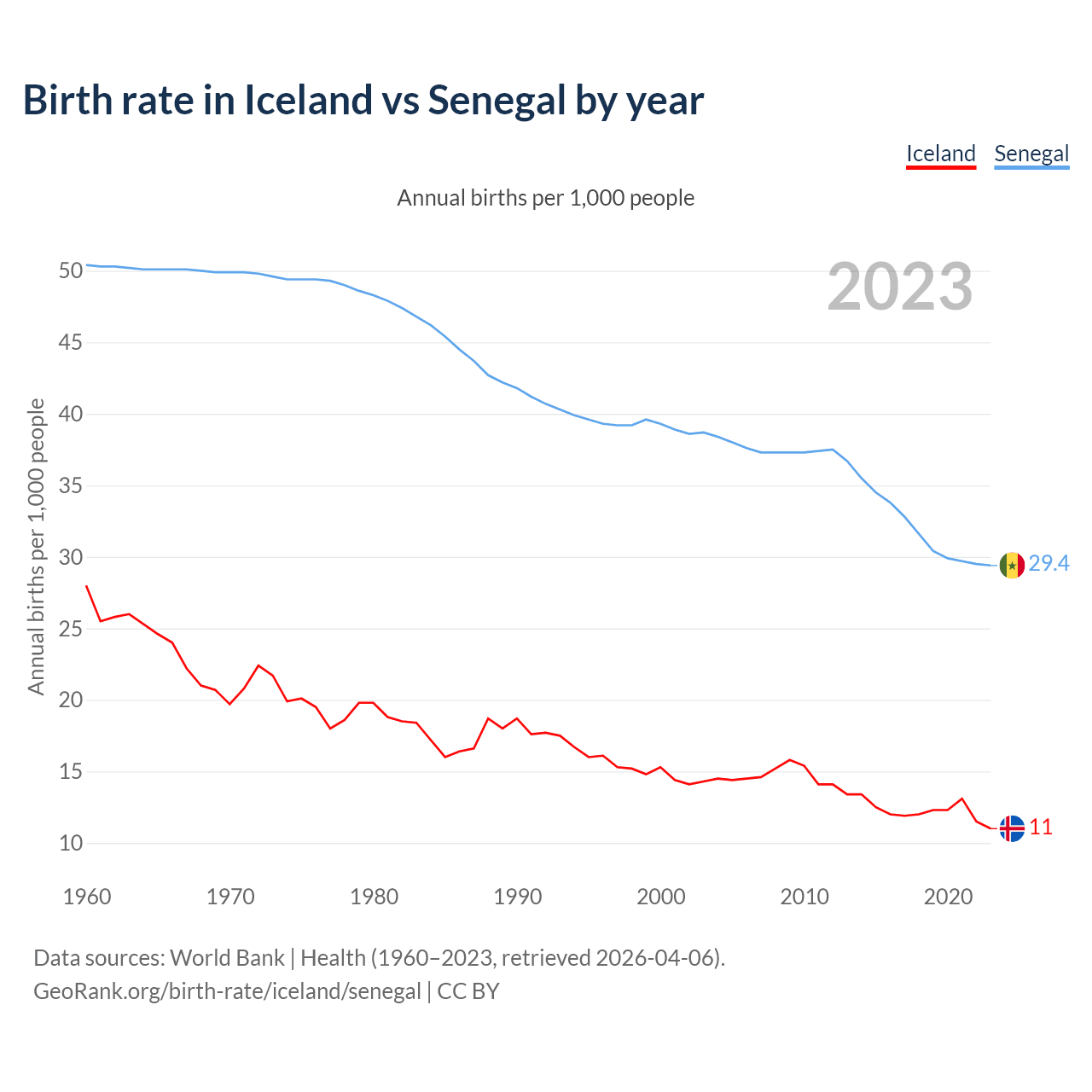 Iceland has an annual birth rate of 11 births per 1,000 people, compared to 29.4 for Senegal. The average number of children a woman is expected to have during her lifetime — the fertility rate, is 1.59 in Iceland and 3.82 in Senegal — 140.1% difference.