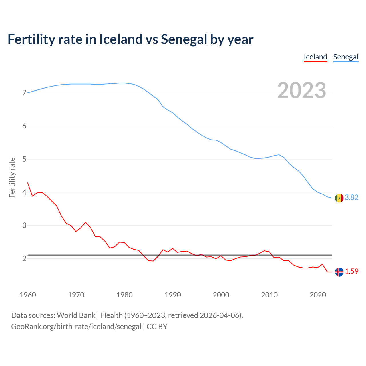 According to the latest available data on birth rates, the fertility rate in Iceland was 1.59 children per woman in 2023, compared to 3.82 in Senegal in 2023. The replacement level is considered to be 2.1 children per woman.