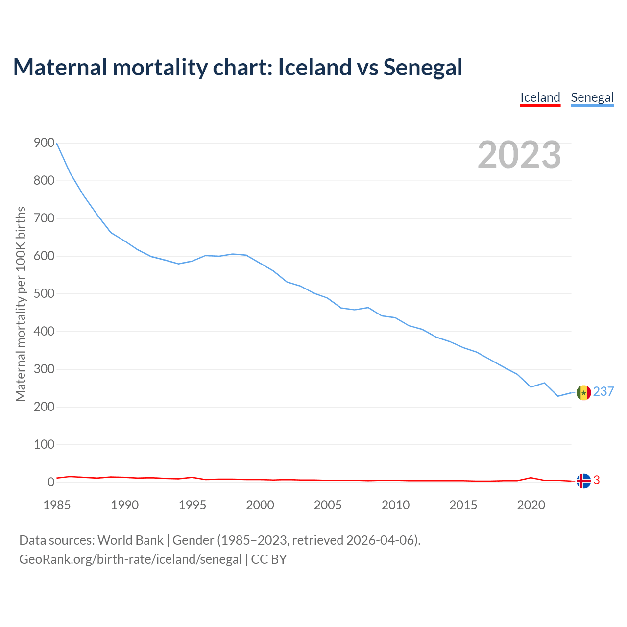 The maternal mortality rate, which is the probability of dying during childbirth or within 42 days of pregnancy termination, is 3 deaths per 100,000 live births in Iceland, compared to 237 deaths in Senegal.