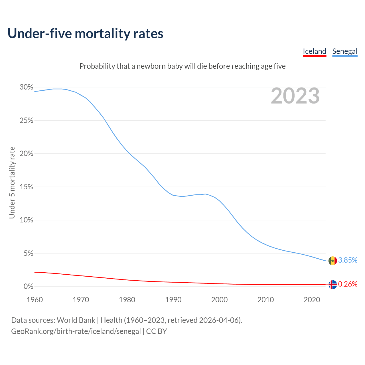 The chance that a newborn baby will die before reaching age five is 0.26% in Iceland and 3.85% in Senegal. Above is a chart with historical data on under-five mortality rates.