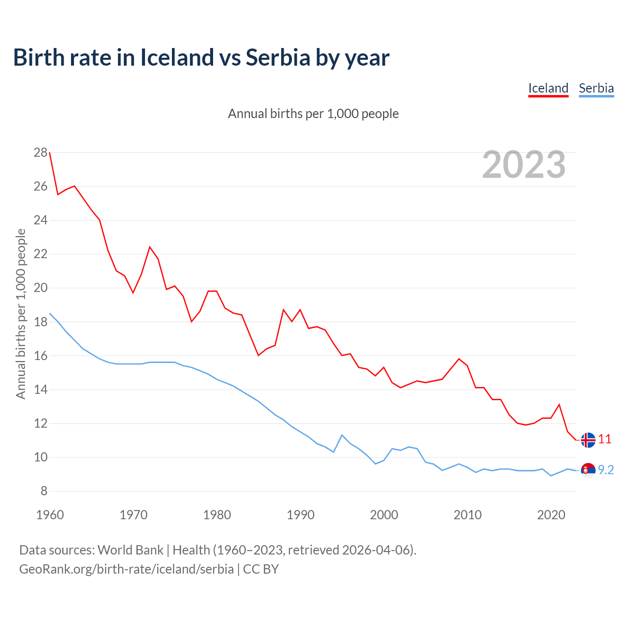 Iceland has an annual birth rate of 11 births per 1,000 people, compared to 9.2 for Serbia. The average number of children a woman is expected to have during her lifetime — the fertility rate, is 1.59 in Iceland and 1.61 in Serbia — 1.26% difference.