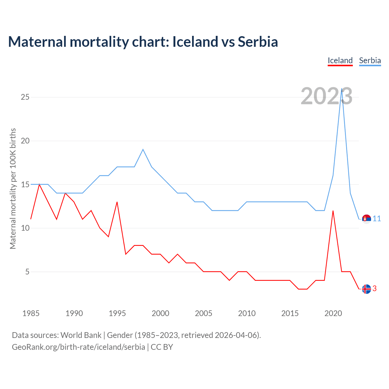 The maternal mortality rate, which is the probability of dying during childbirth or within 42 days of pregnancy termination, is 3 deaths per 100,000 live births in Iceland, compared to 11 deaths in Serbia.