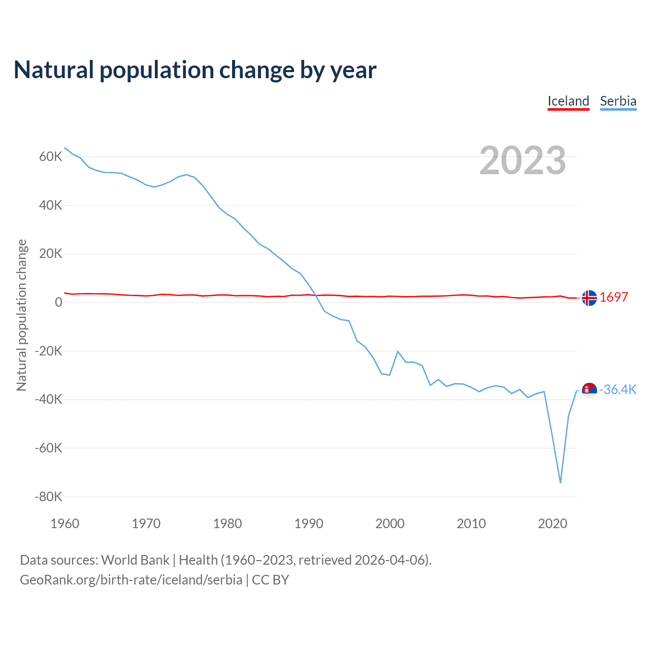 According to the latest available data on birth rates, the fertility rate in Iceland was 1.59 children per woman in 2023, compared to 1.61 in Serbia in 2023. The replacement level is considered to be 2.1 children per woman.