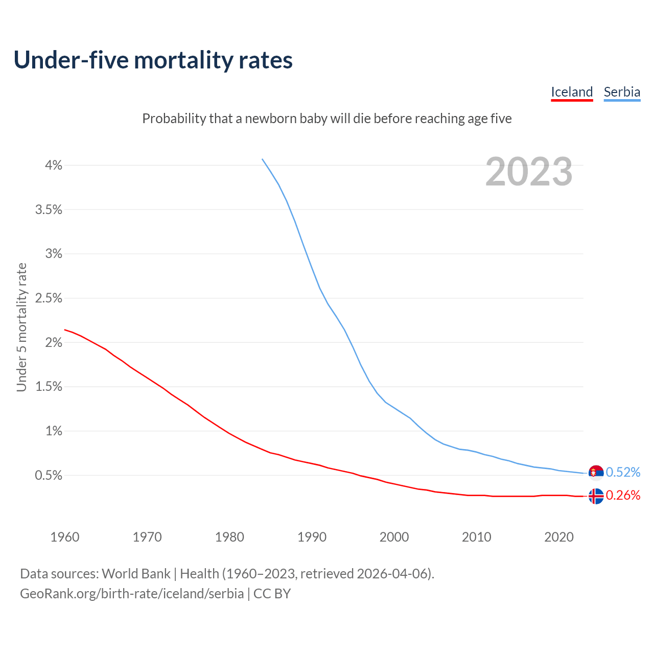 The chance that a newborn baby will die before reaching age five is 0.26% in Iceland and 0.52% in Serbia. Above is a chart with historical data on under-five mortality rates.
