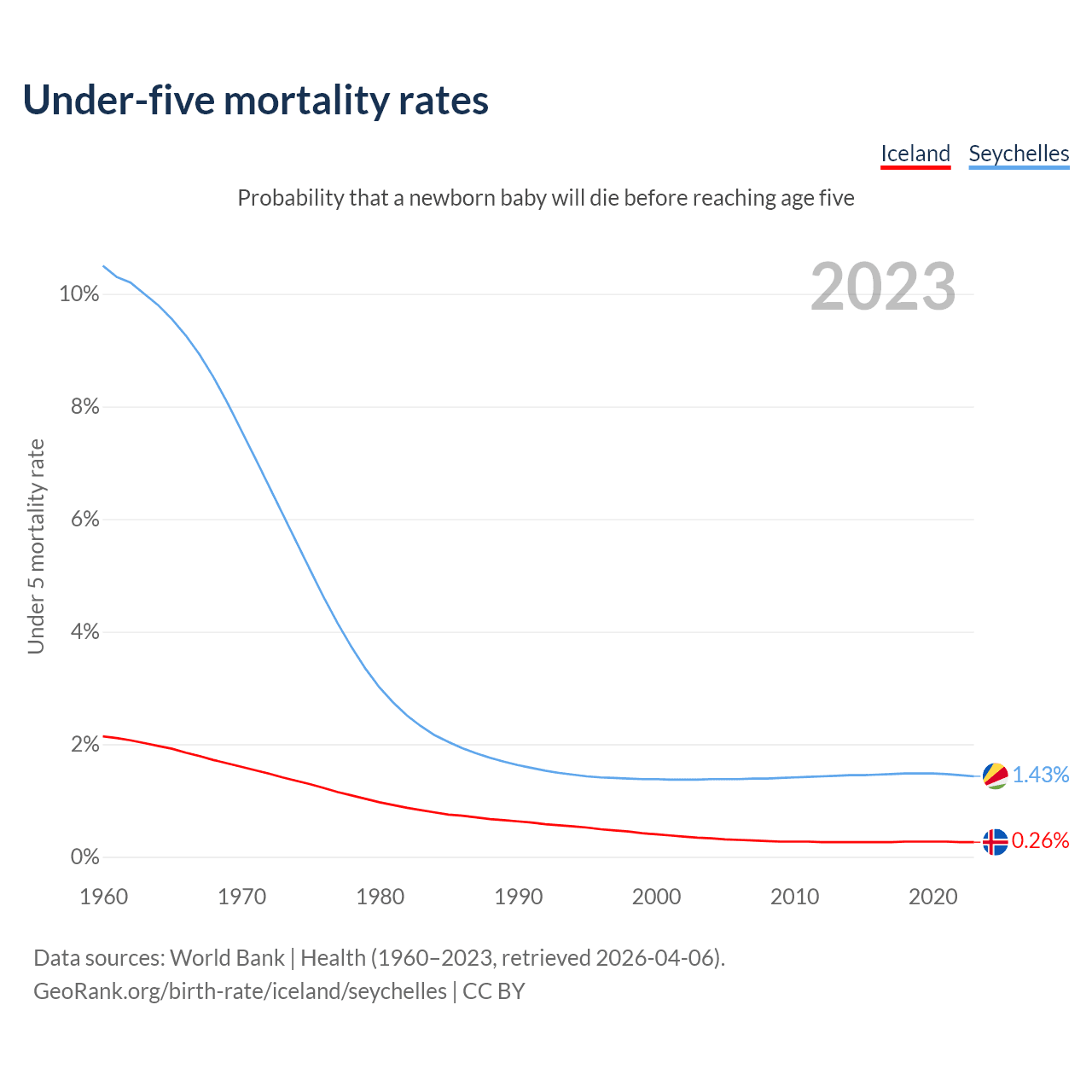 The chance that a newborn baby will die before reaching age five is 0.26% in Iceland and 1.43% in the Seychelles. Above is a chart with historical data on under-five mortality rates.