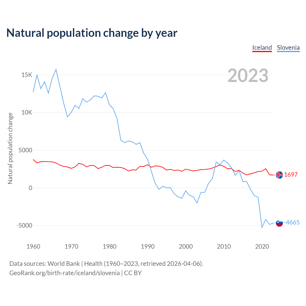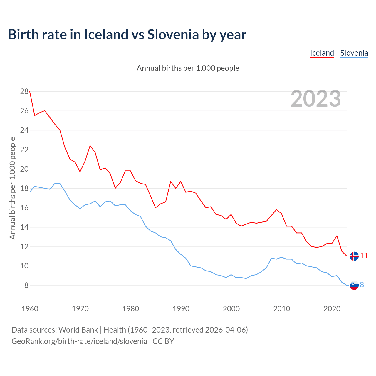 Iceland has an annual birth rate of 11 births per 1,000 people, compared to 8 for Slovenia. The average number of children a woman is expected to have during her lifetime — the fertility rate, is 1.59 in Iceland and 1.51 in Slovenia — 5.03% difference.
