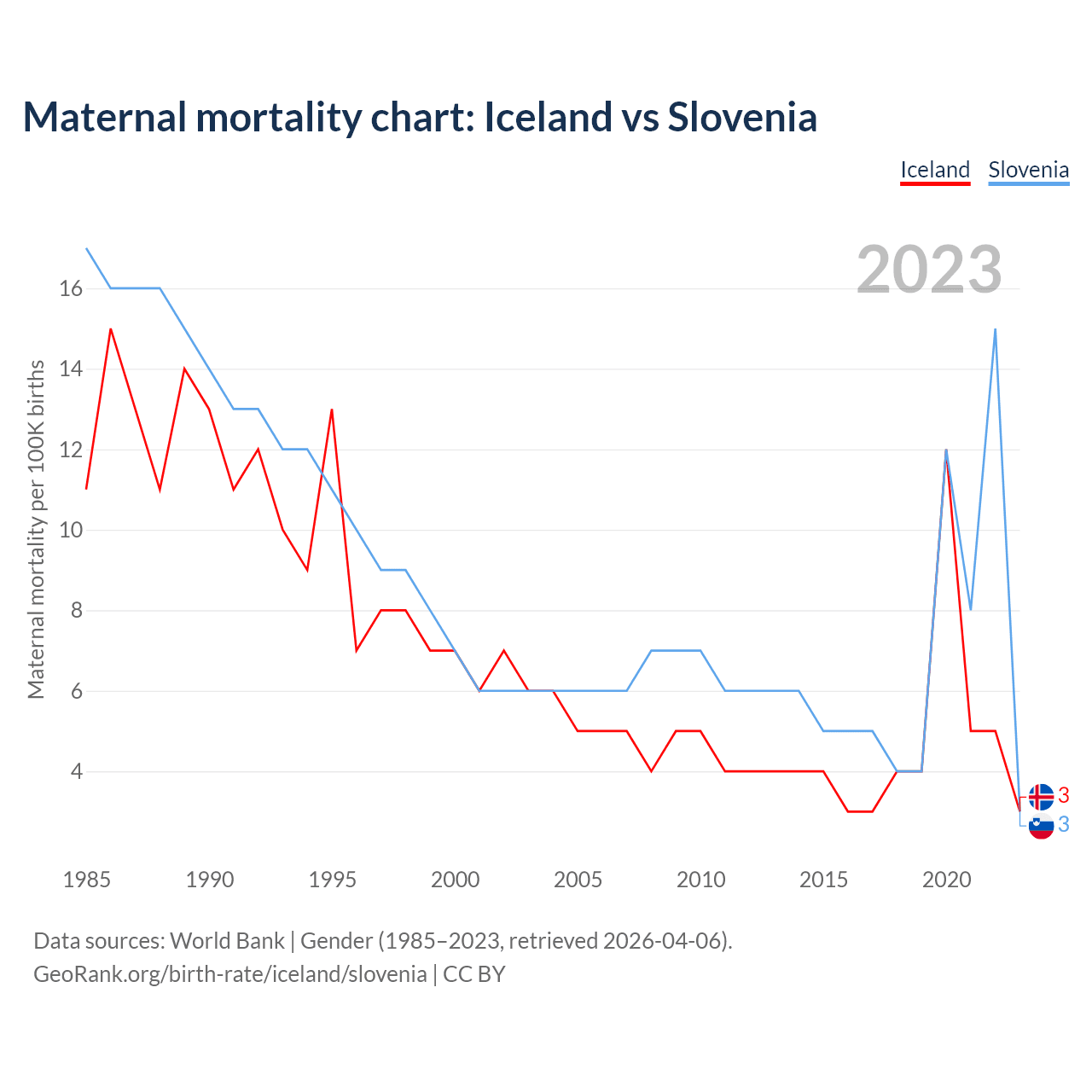 The maternal mortality rate, which is the probability of dying during childbirth or within 42 days of pregnancy termination, is 3 deaths per 100,000 live births in Iceland, compared to 3 deaths in Slovenia.
