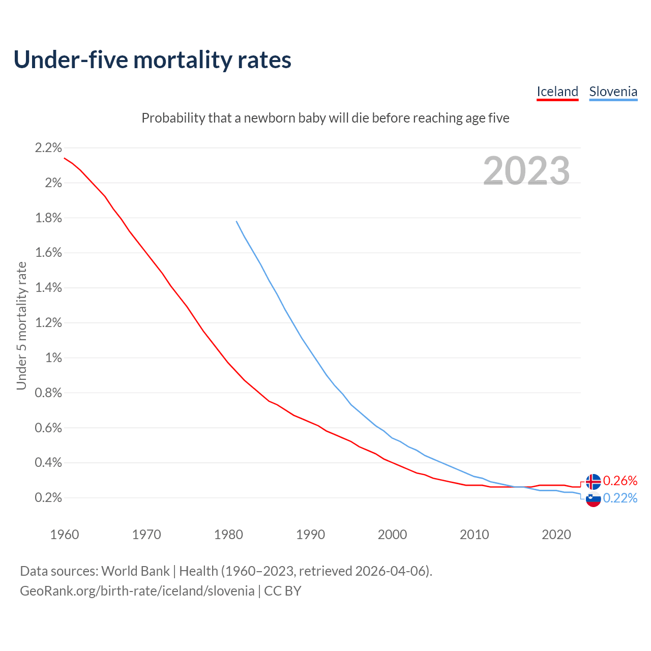 The chance that a newborn baby will die before reaching age five is 0.26% in Iceland and 0.22% in Slovenia. Above is a chart with historical data on under-five mortality rates.