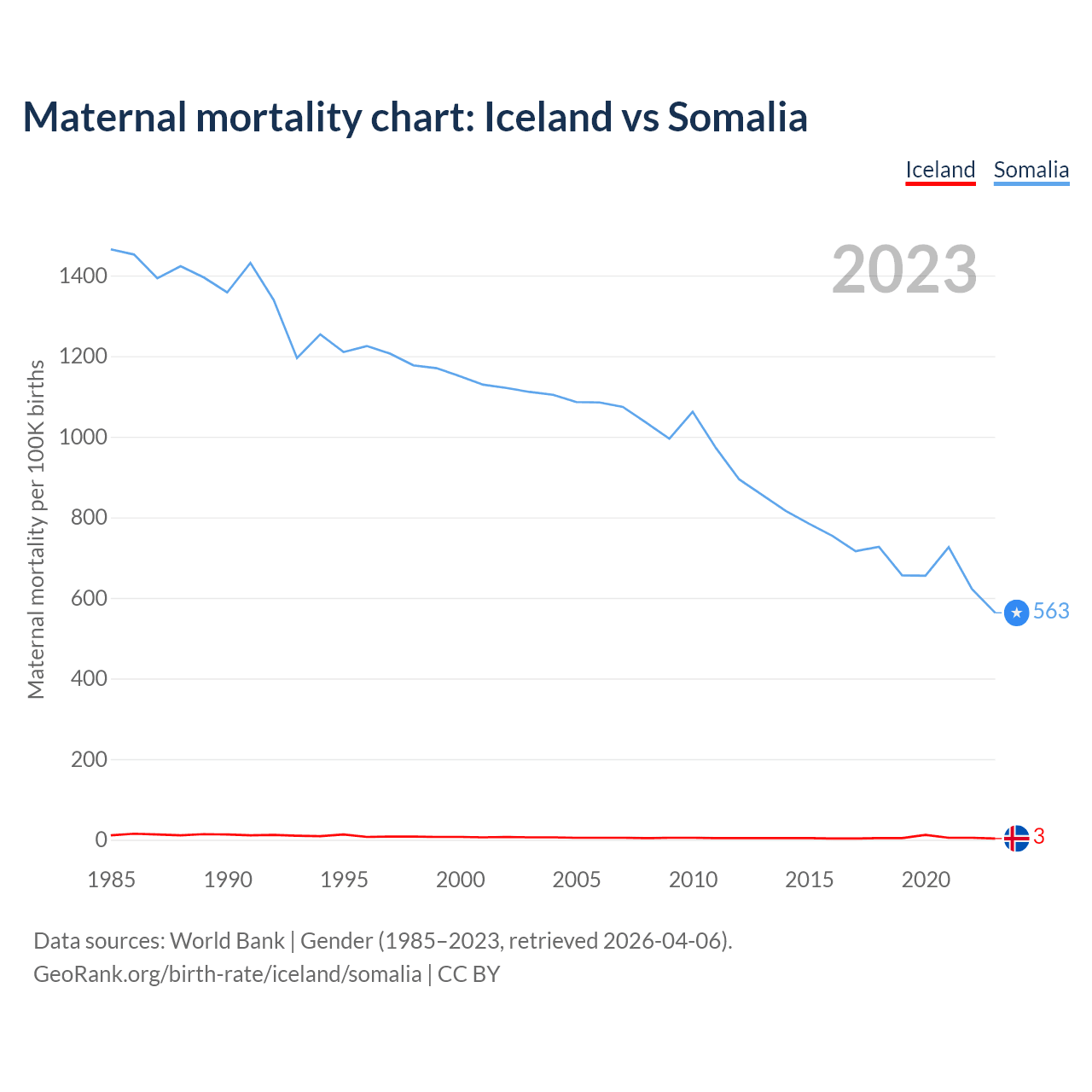 The maternal mortality rate, which is the probability of dying during childbirth or within 42 days of pregnancy termination, is 3 deaths per 100,000 live births in Iceland, compared to 563 deaths in Somalia.