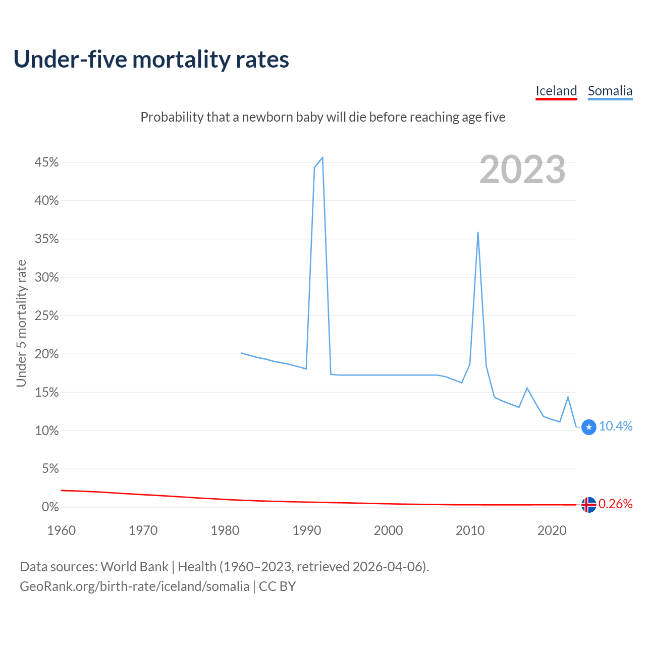 The chance that a newborn baby will die before reaching age five is 0.26% in Iceland and 10.4% in Somalia. Above is a chart with historical data on under-five mortality rates.