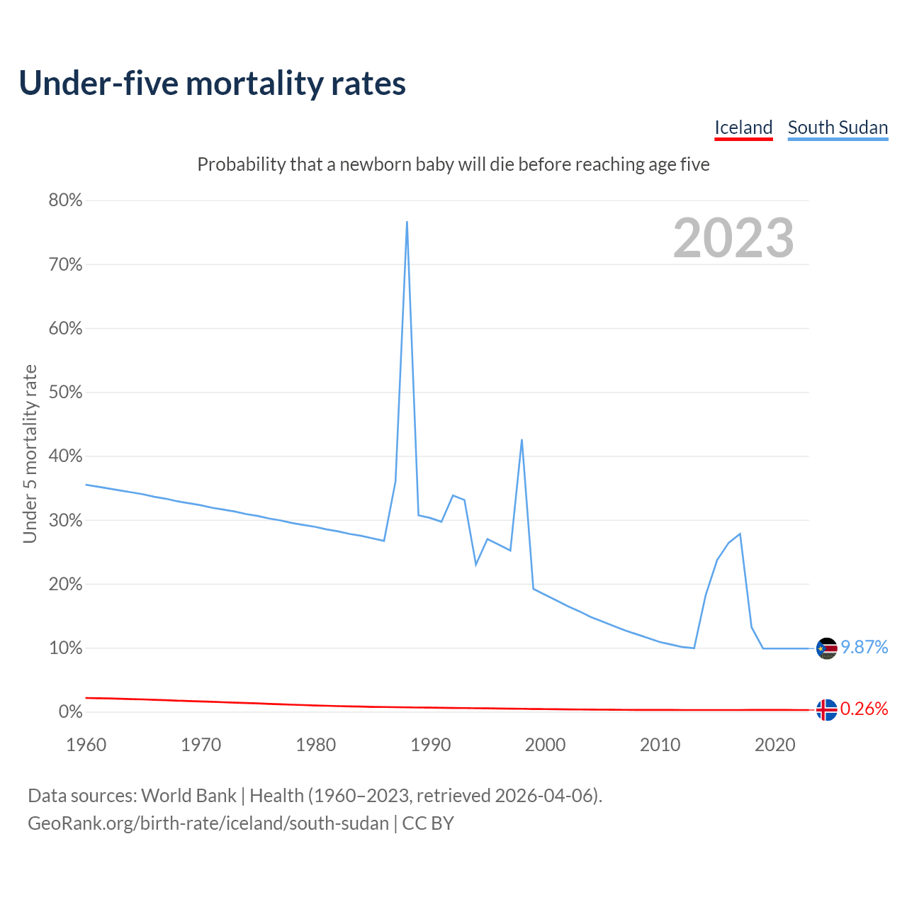 The chance that a newborn baby will die before reaching age five is 0.26% in Iceland and 9.87% in South Sudan. Above is a chart with historical data on under-five mortality rates.
