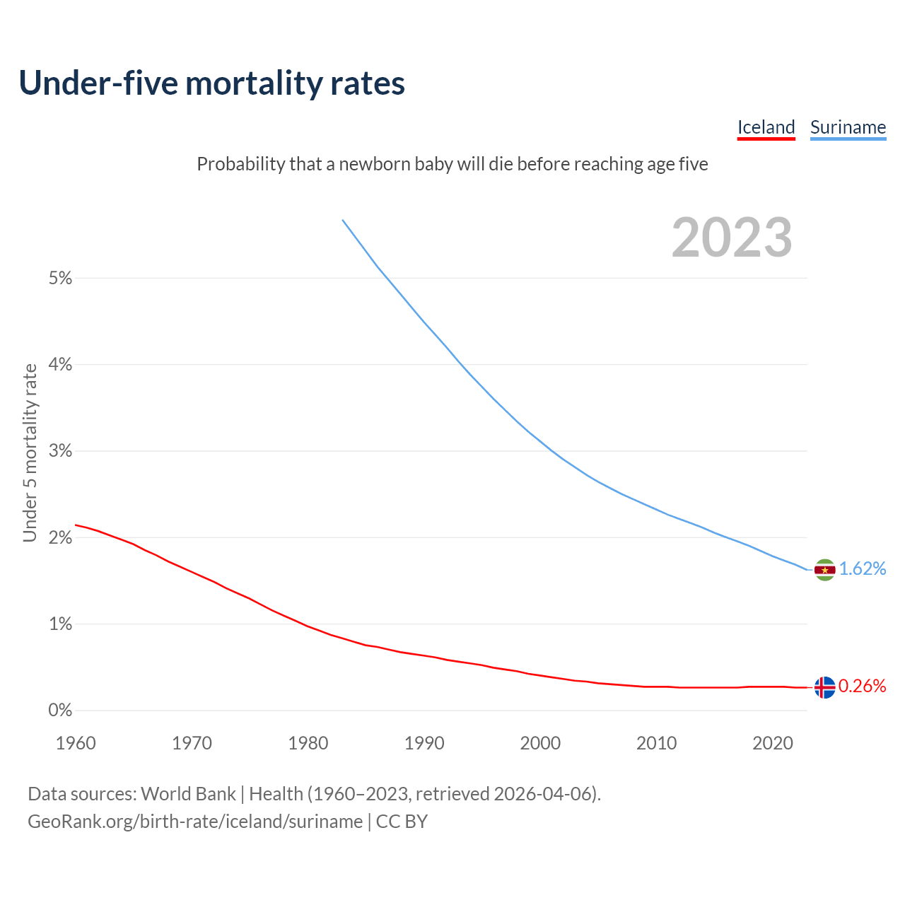The chance that a newborn baby will die before reaching age five is 0.26% in Iceland and 1.62% in Suriname. Above is a chart with historical data on under-five mortality rates.
