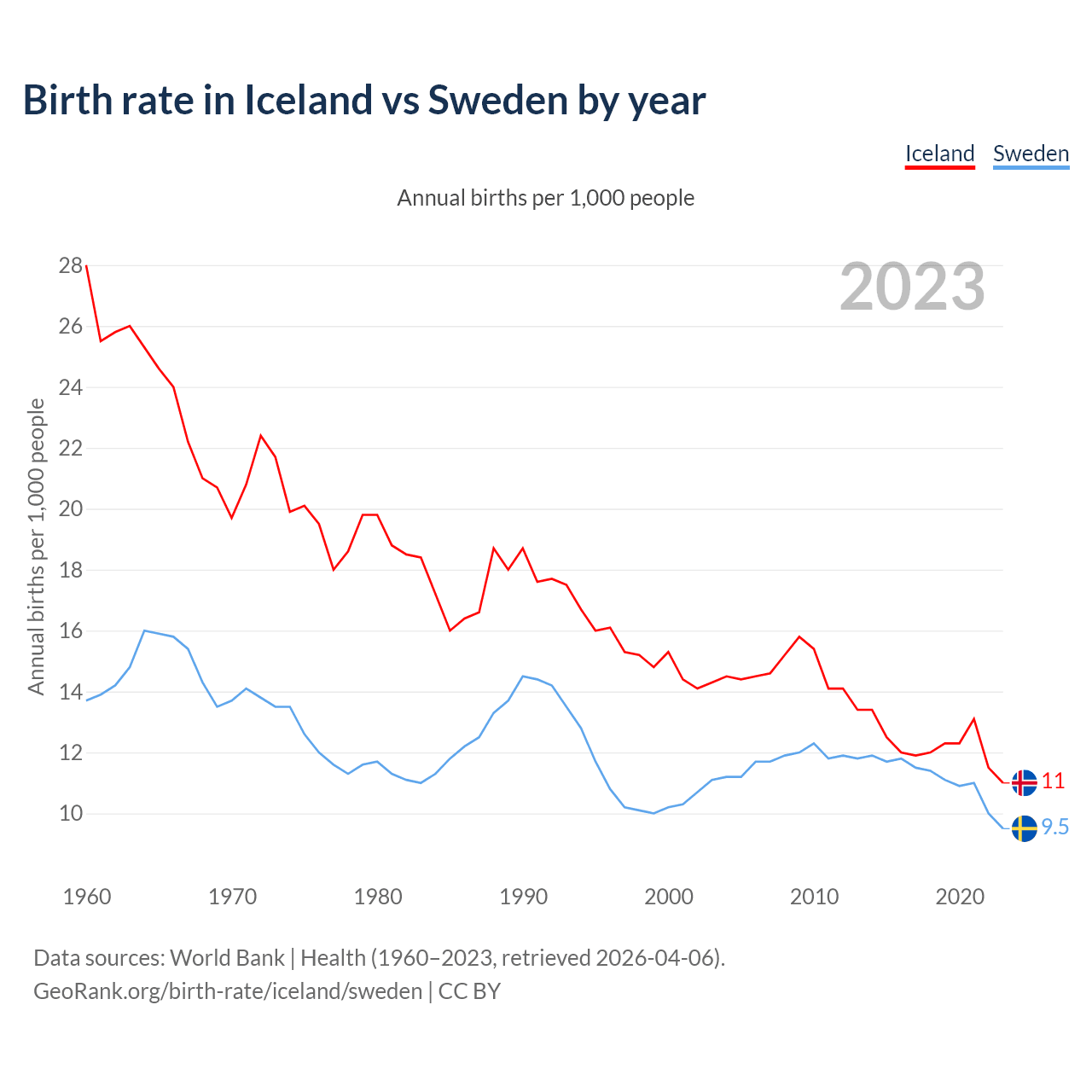 Iceland has an annual birth rate of 11 births per 1,000 people, compared to 9.5 for Sweden. The average number of children a woman is expected to have during her lifetime — the fertility rate, is 1.59 in Iceland and 1.45 in Sweden — 8.81% difference.