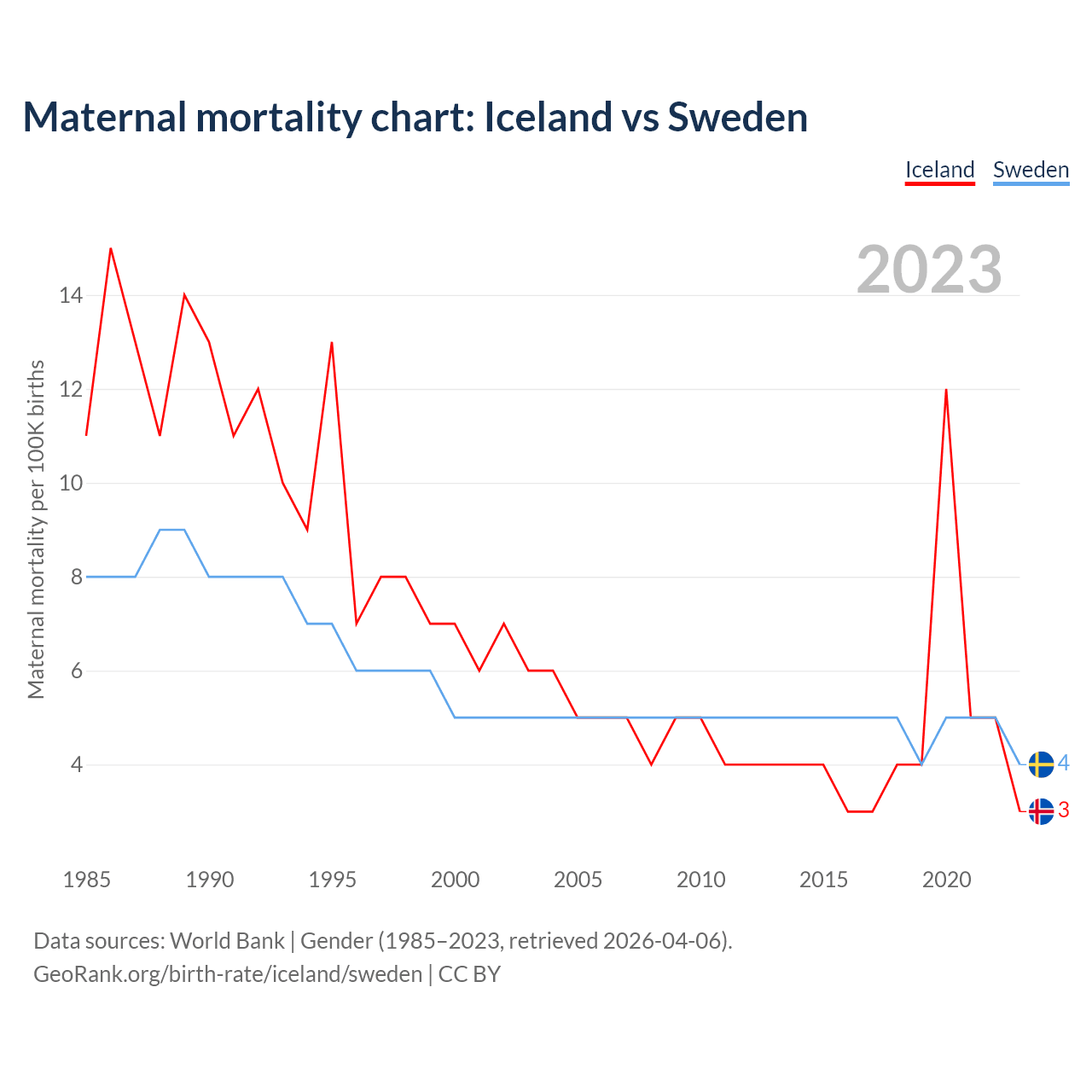 The maternal mortality rate, which is the probability of dying during childbirth or within 42 days of pregnancy termination, is 3 deaths per 100,000 live births in Iceland, compared to 4 deaths in Sweden.