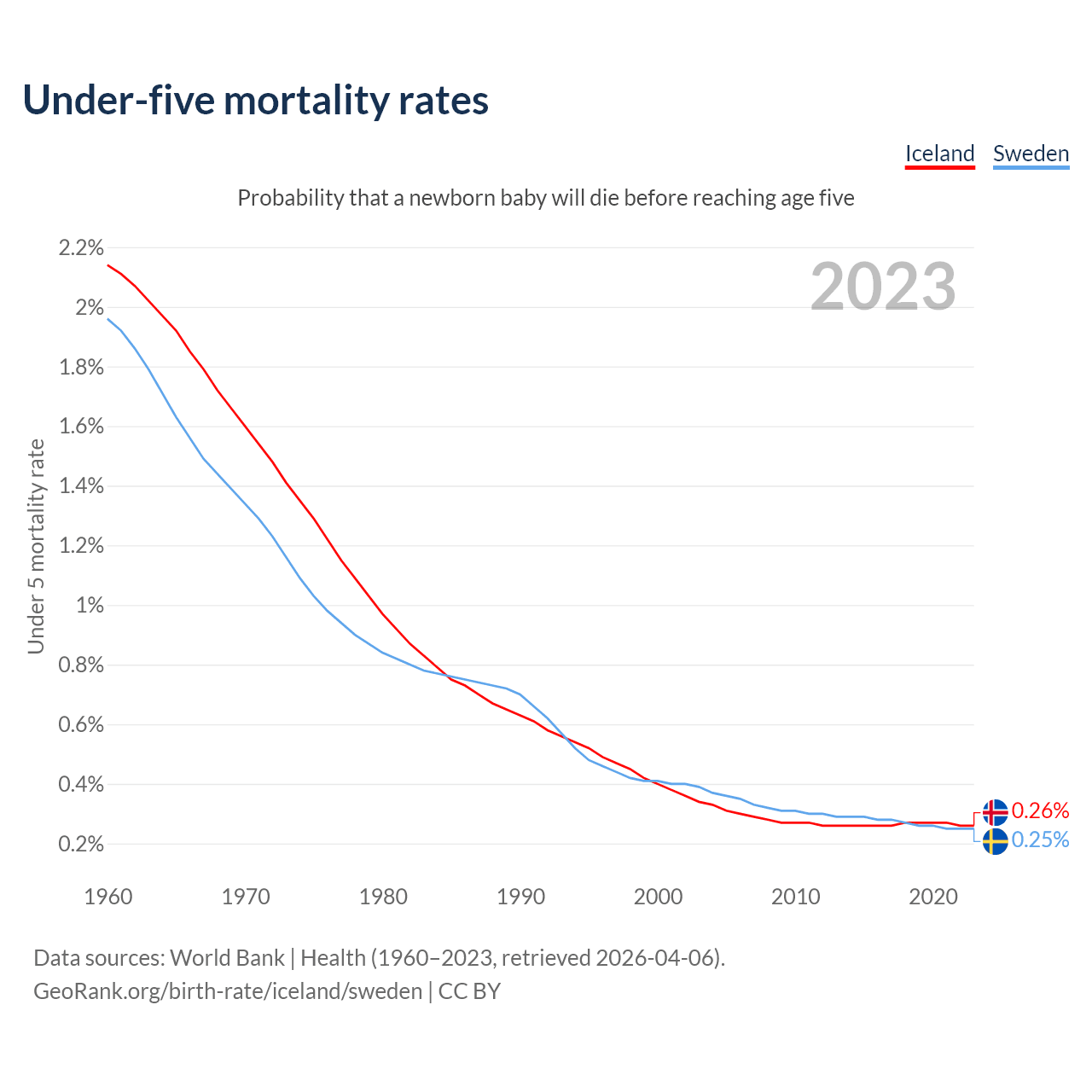 The chance that a newborn baby will die before reaching age five is 0.26% in Iceland and 0.25% in Sweden. Above is a chart with historical data on under-five mortality rates.