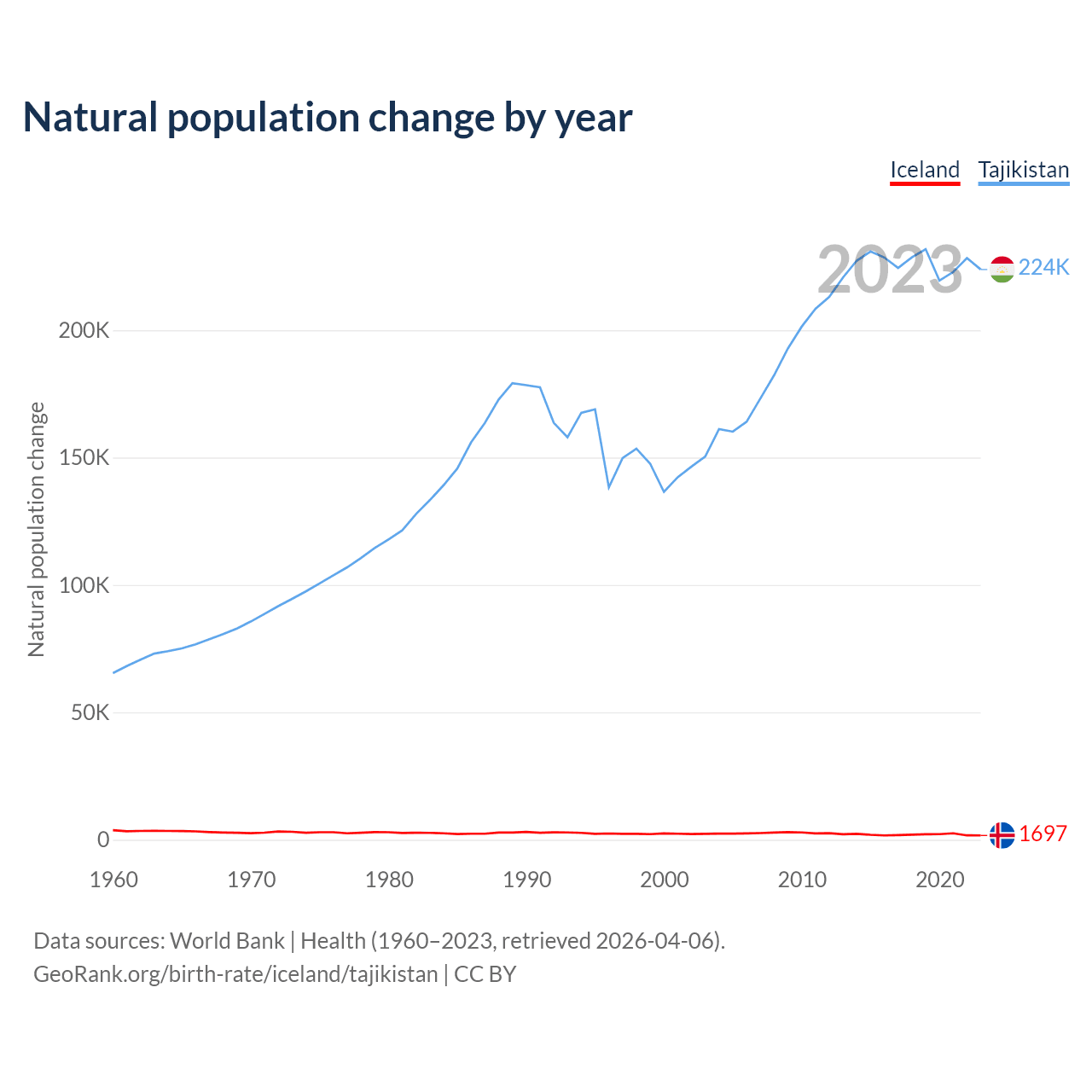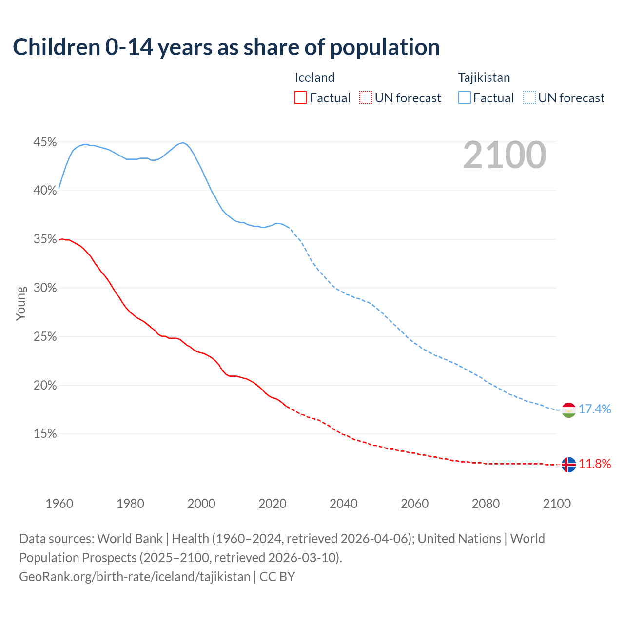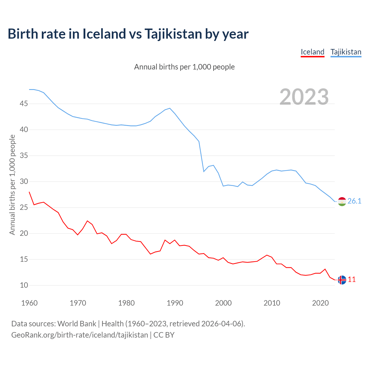 Iceland has an annual birth rate of 11 births per 1,000 people, compared to 26.1 for Tajikistan. The average number of children a woman is expected to have during her lifetime — the fertility rate, is 1.59 in Iceland and 3.07 in Tajikistan — 93.2% difference.