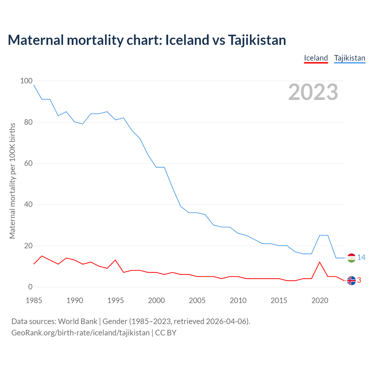 The maternal mortality rate, which is the probability of dying during childbirth or within 42 days of pregnancy termination, is 3 deaths per 100,000 live births in Iceland, compared to 14 deaths in Tajikistan.