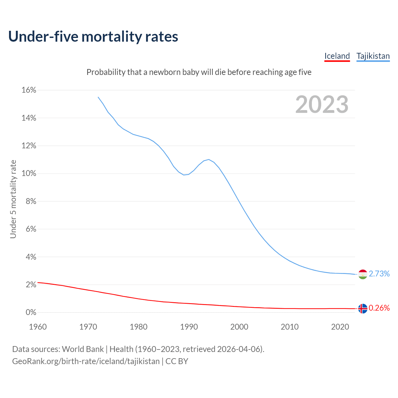 The chance that a newborn baby will die before reaching age five is 0.26% in Iceland and 2.73% in Tajikistan. Above is a chart with historical data on under-five mortality rates.