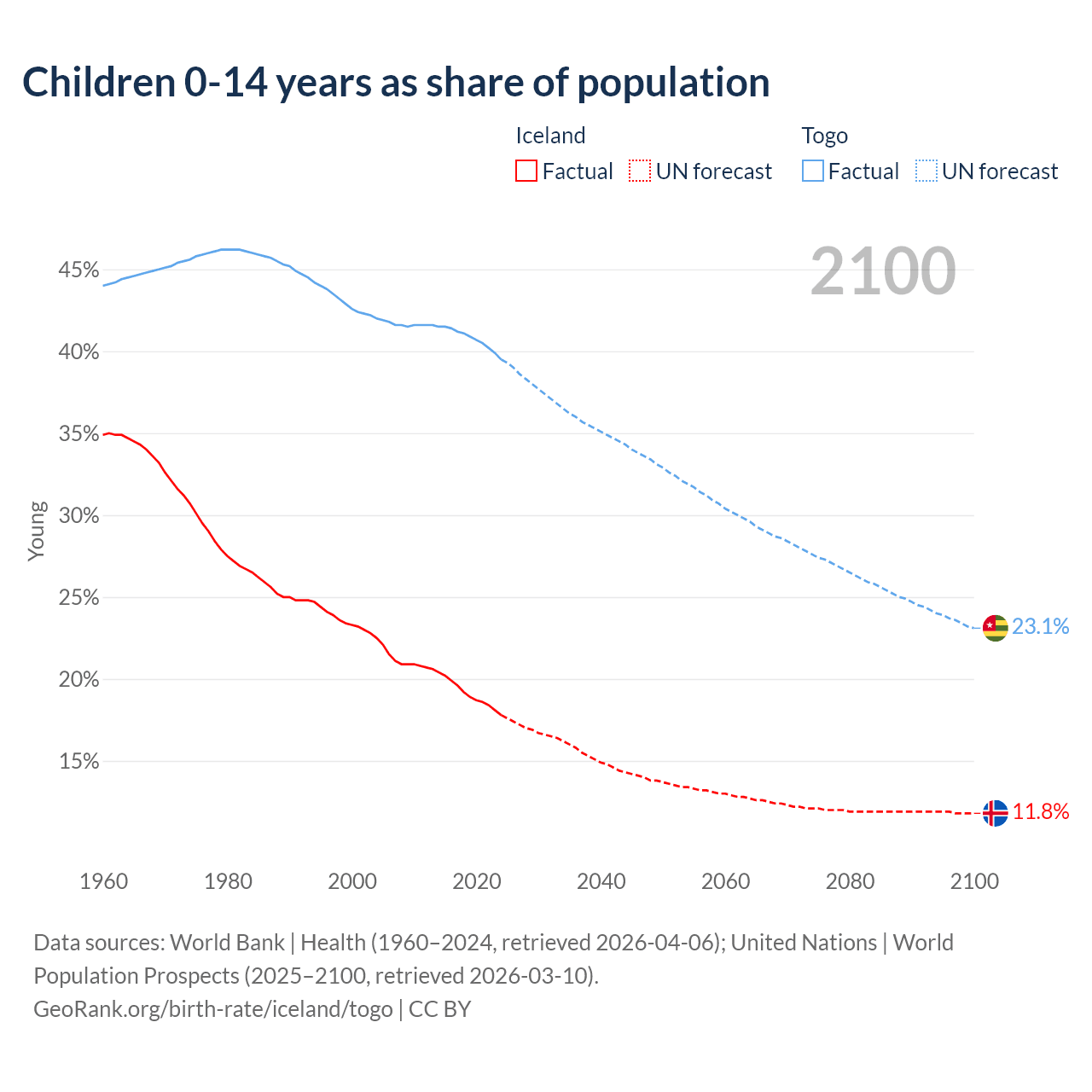 Iceland has an annual birth rate of 11 births per 1,000 people, compared to 31.1 for Togo. The average number of children a woman is expected to have during her lifetime — the fertility rate, is 1.59 in Iceland and 4.19 in Togo — 163.6% difference.