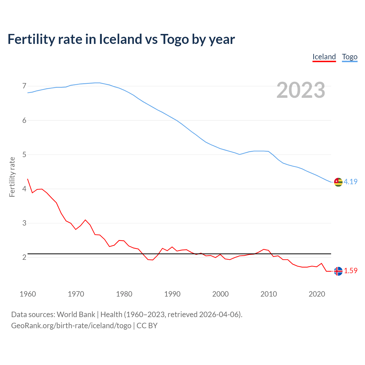 According to the latest available data on birth rates, the fertility rate in Iceland was 1.59 children per woman in 2023, compared to 4.19 in Togo in 2023. The replacement level is considered to be 2.1 children per woman.