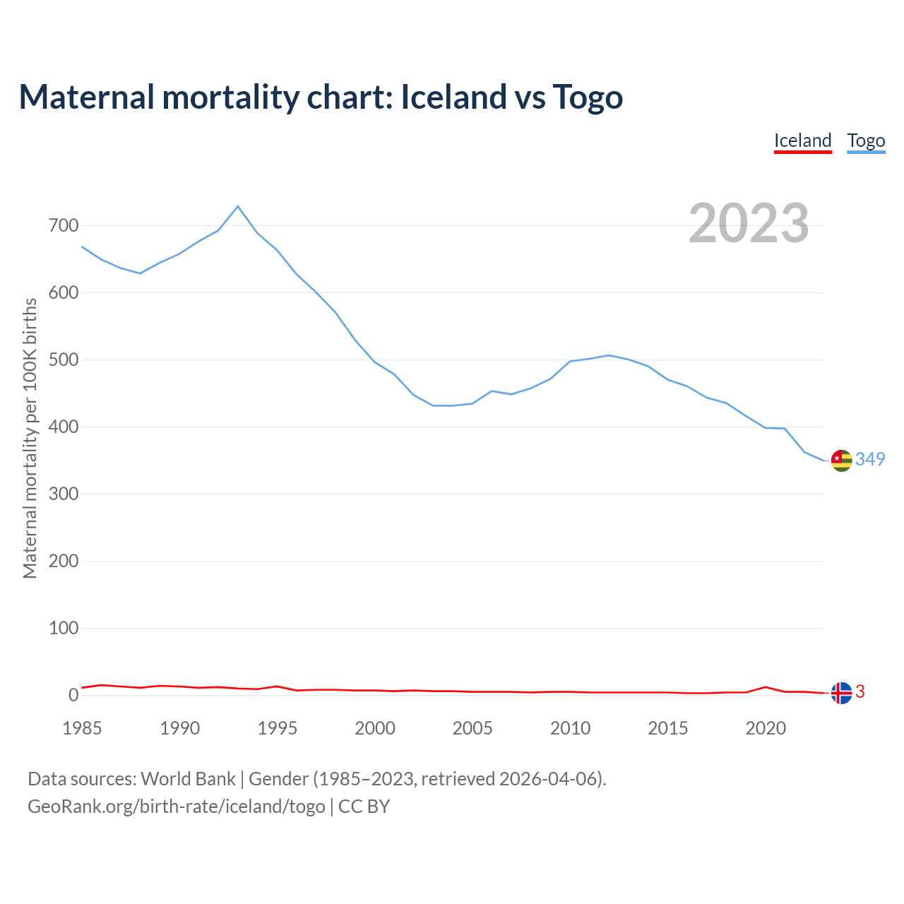 The maternal mortality rate, which is the probability of dying during childbirth or within 42 days of pregnancy termination, is 3 deaths per 100,000 live births in Iceland, compared to 349 deaths in Togo.