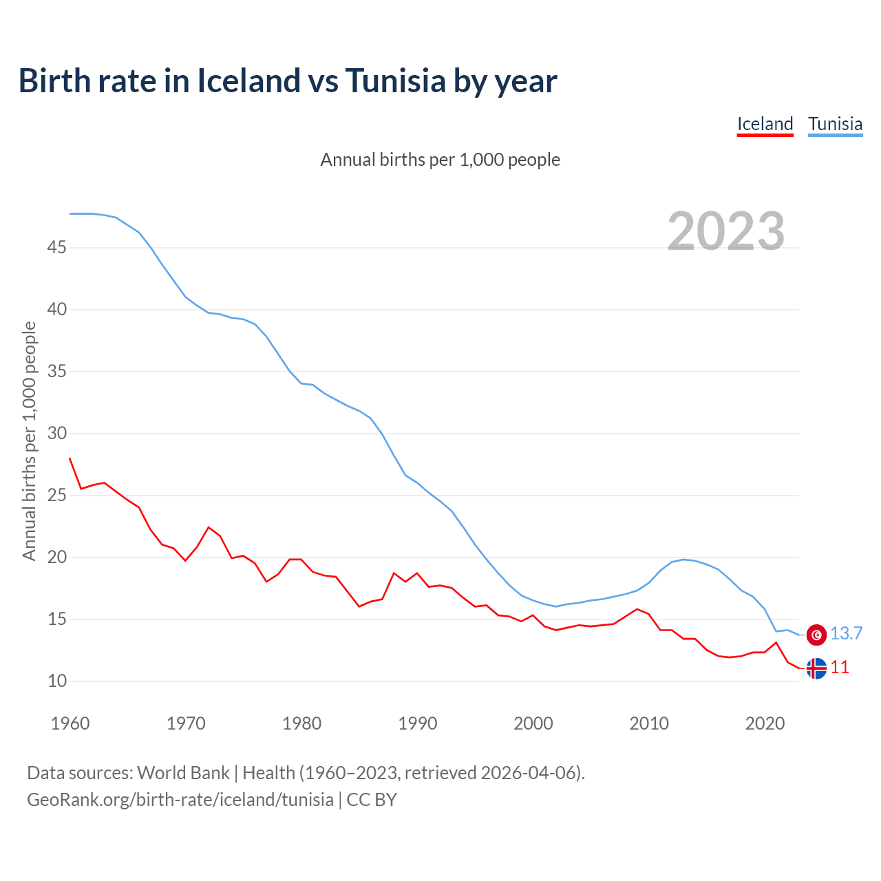 Iceland has an annual birth rate of 11 births per 1,000 people, compared to 13.7 for Tunisia. The average number of children a woman is expected to have during her lifetime — the fertility rate, is 1.59 in Iceland and 1.83 in Tunisia — 15.2% difference.