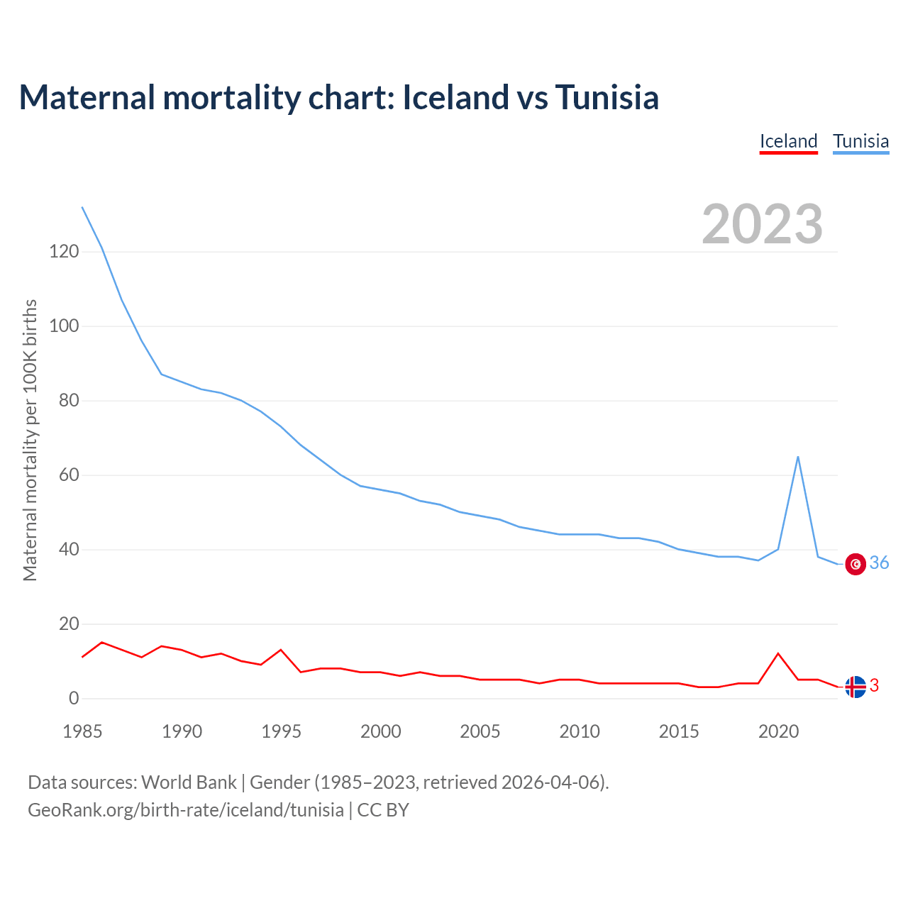 The maternal mortality rate, which is the probability of dying during childbirth or within 42 days of pregnancy termination, is 3 deaths per 100,000 live births in Iceland, compared to 36 deaths in Tunisia.
