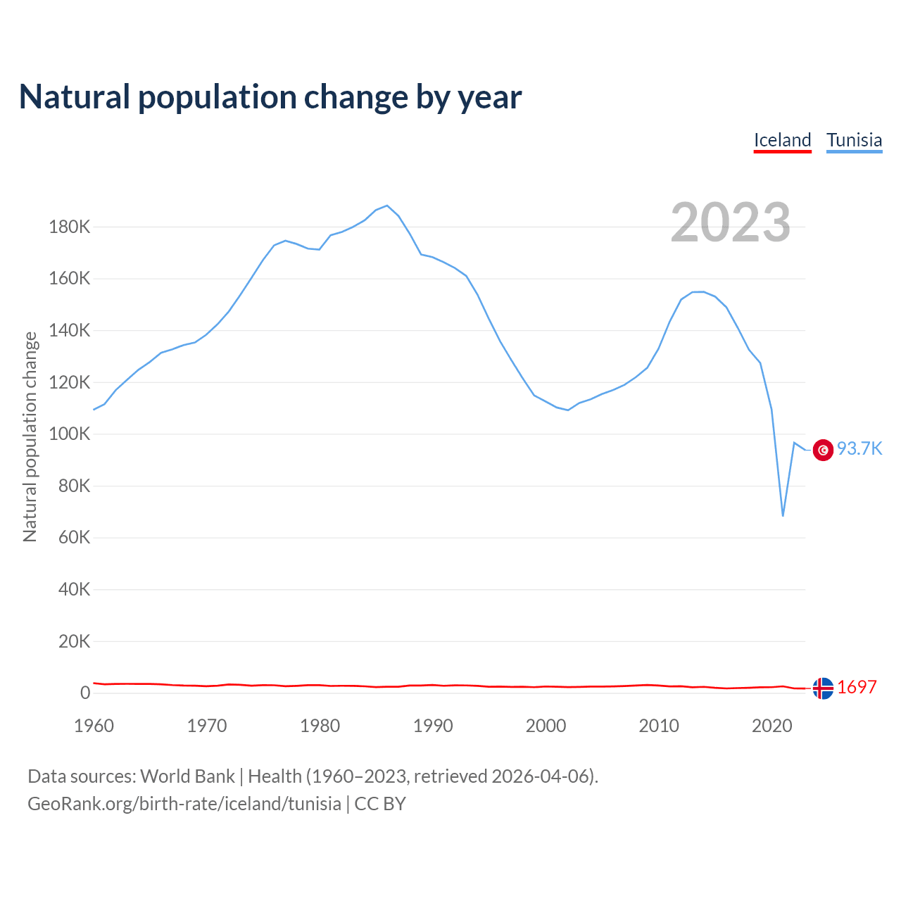 - Iceland is ranked 132/196 by birth rate compared to 104/196 for Tunisia.