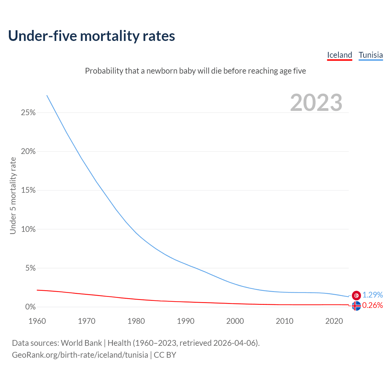 The chance that a newborn baby will die before reaching age five is 0.26% in Iceland and 1.29% in Tunisia. Above is a chart with historical data on under-five mortality rates.