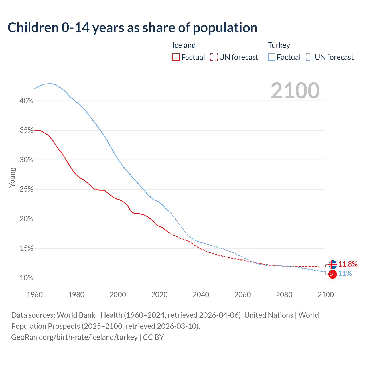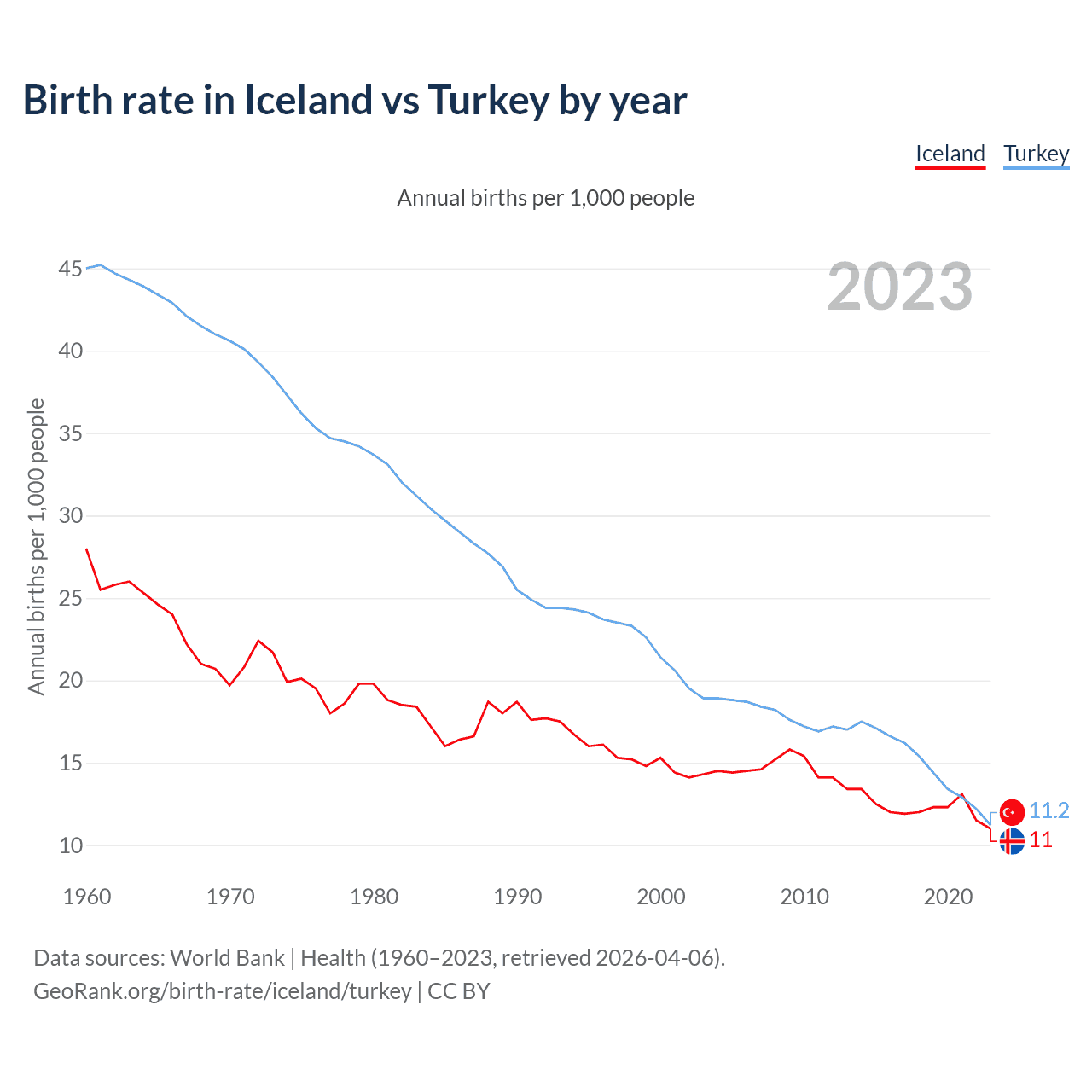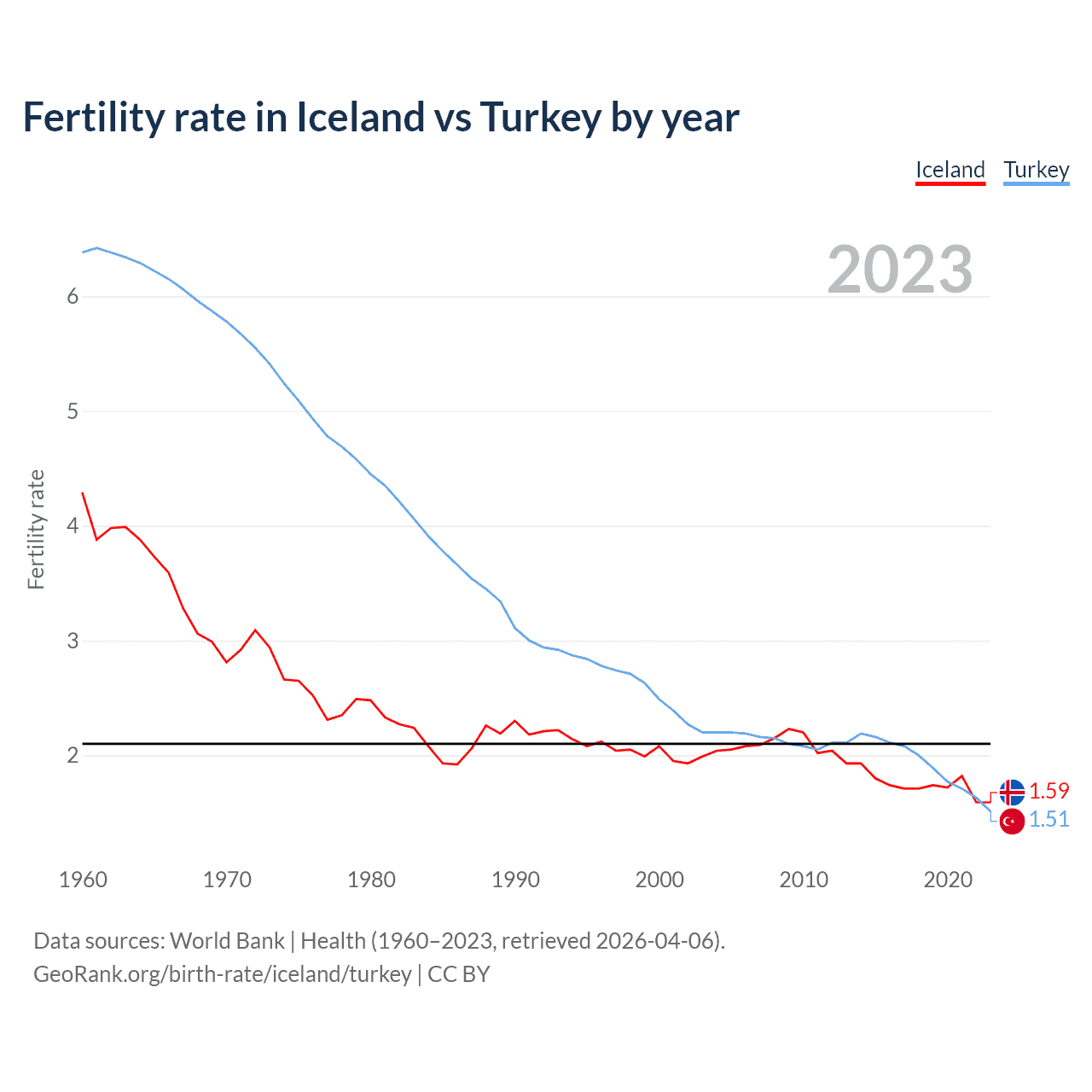 According to the latest available data on birth rates, the fertility rate in Iceland was 1.59 children per woman in 2023, compared to 1.51 in Turkey in 2023. The replacement level is considered to be 2.1 children per woman.