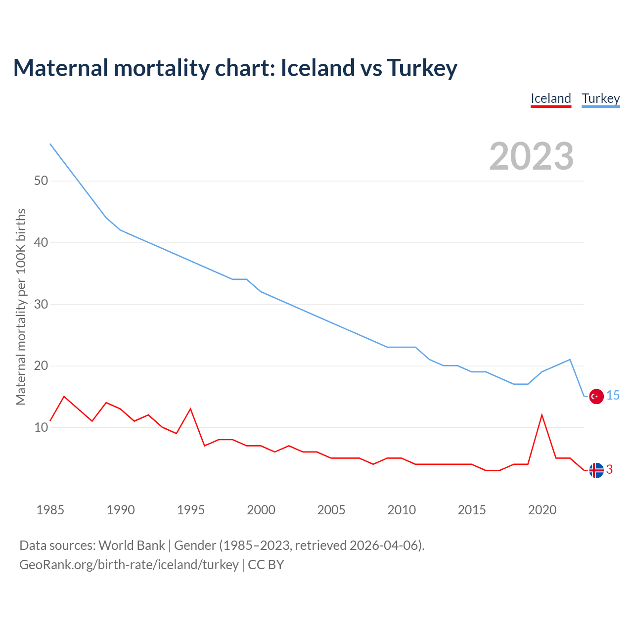 The maternal mortality rate, which is the probability of dying during childbirth or within 42 days of pregnancy termination, is 3 deaths per 100,000 live births in Iceland, compared to 15 deaths in Turkey.