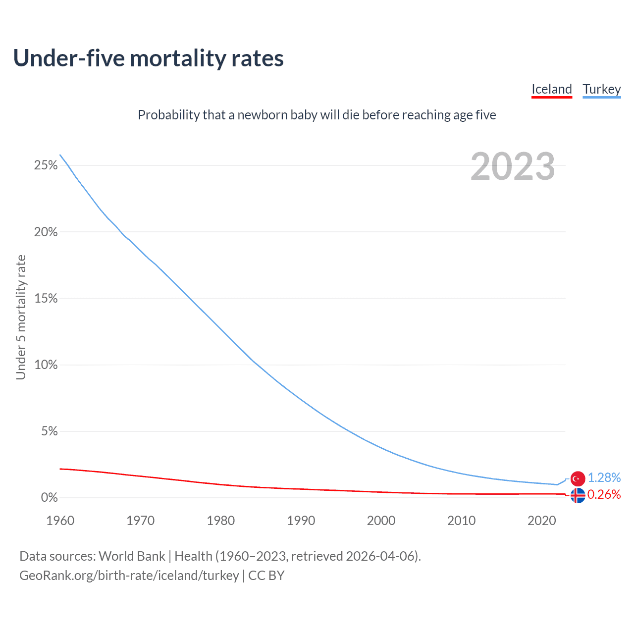 The chance that a newborn baby will die before reaching age five is 0.26% in Iceland and 1.28% in Turkey. Above is a chart with historical data on under-five mortality rates.