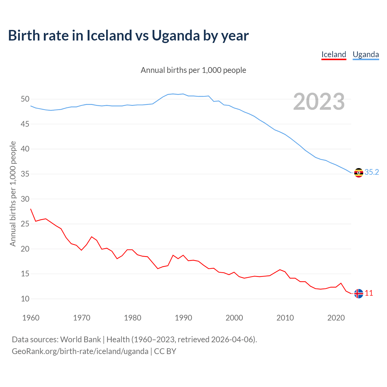 Iceland has an annual birth rate of 11 births per 1,000 people, compared to 35.2 for Uganda. The average number of children a woman is expected to have during her lifetime — the fertility rate, is 1.59 in Iceland and 4.28 in Uganda — 169.4% difference.