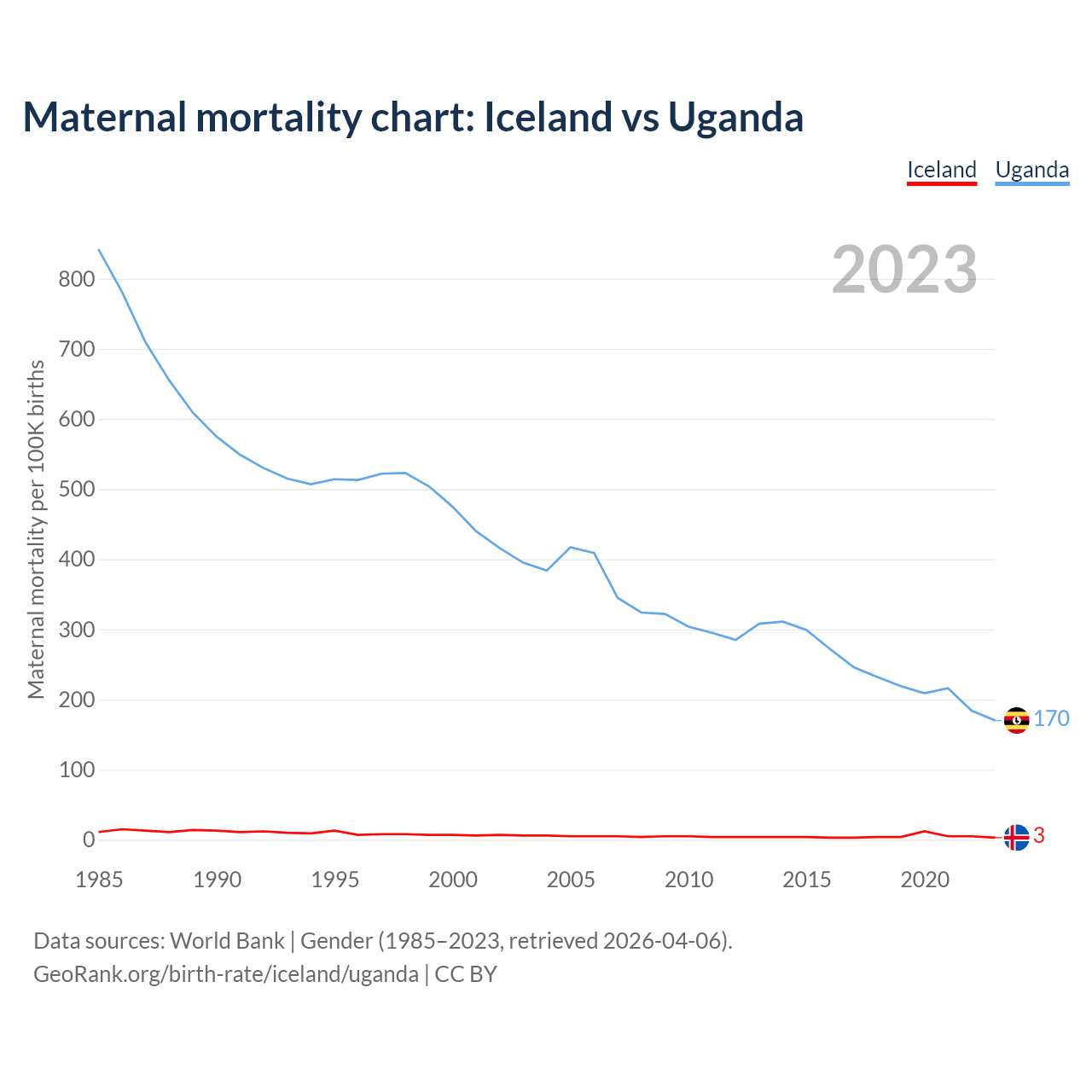 The maternal mortality rate, which is the probability of dying during childbirth or within 42 days of pregnancy termination, is 3 deaths per 100,000 live births in Iceland, compared to 170 deaths in Uganda.