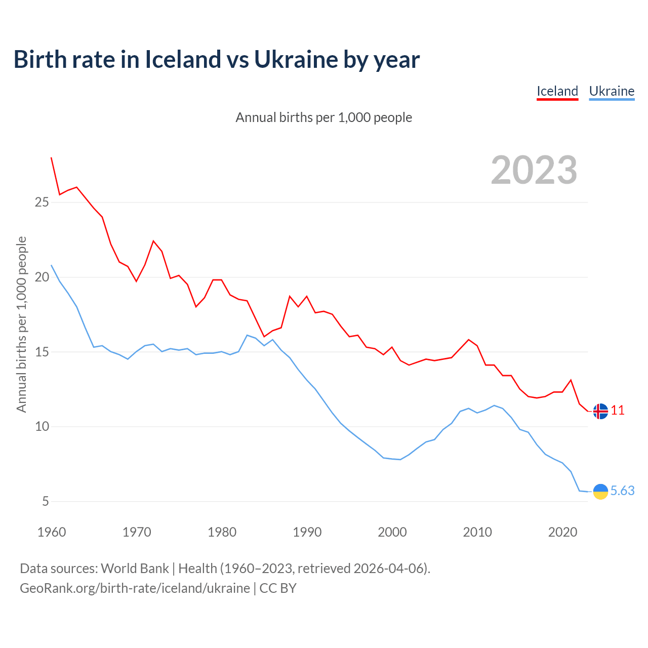 Iceland has an annual birth rate of 11 births per 1,000 people, compared to 5.63 for Ukraine. The average number of children a woman is expected to have during her lifetime — the fertility rate, is 1.59 in Iceland and 0.98 in Ukraine — 38.6% difference.