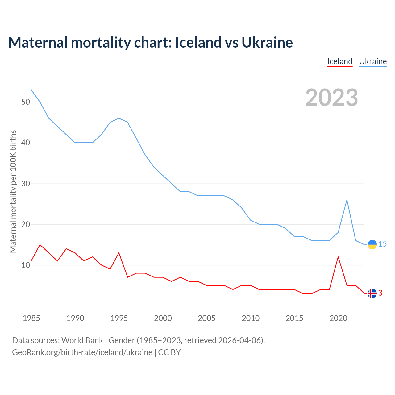 The maternal mortality rate, which is the probability of dying during childbirth or within 42 days of pregnancy termination, is 3 deaths per 100,000 live births in Iceland, compared to 15 deaths in Ukraine.