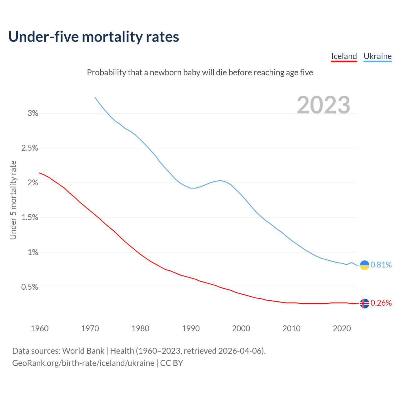 The chance that a newborn baby will die before reaching age five is 0.26% in Iceland and 0.81% in Ukraine. Above is a chart with historical data on under-five mortality rates.