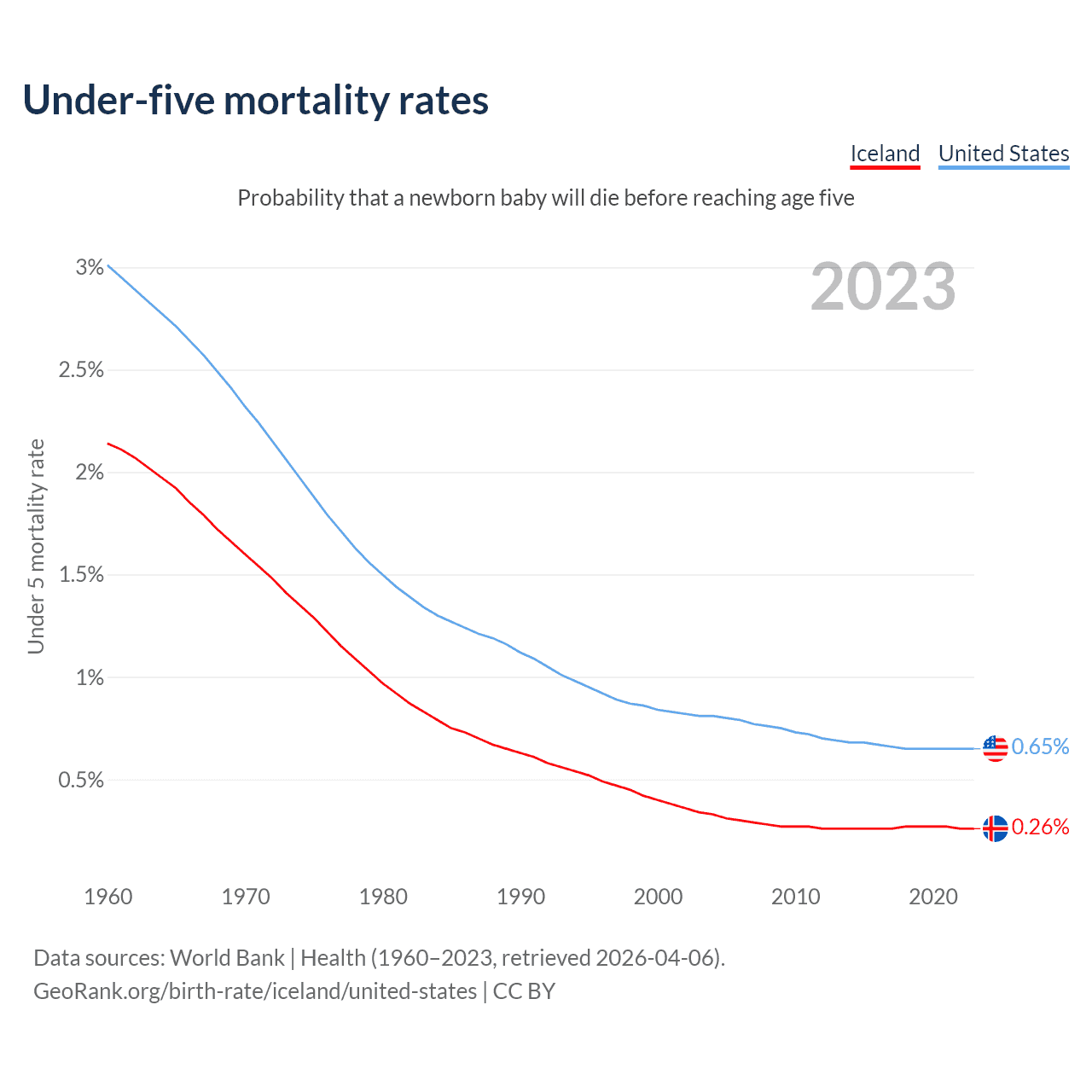 The chance that a newborn baby will die before reaching age five is 0.26% in Iceland and 0.65% in the United States. Above is a chart with historical data on under-five mortality rates.