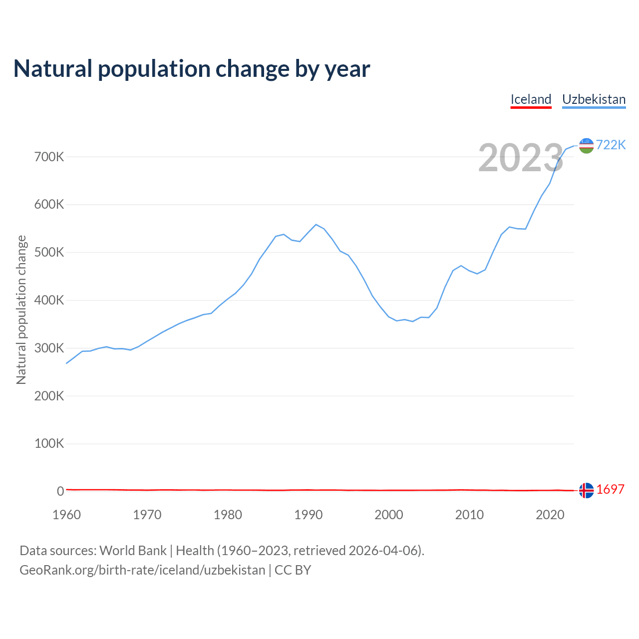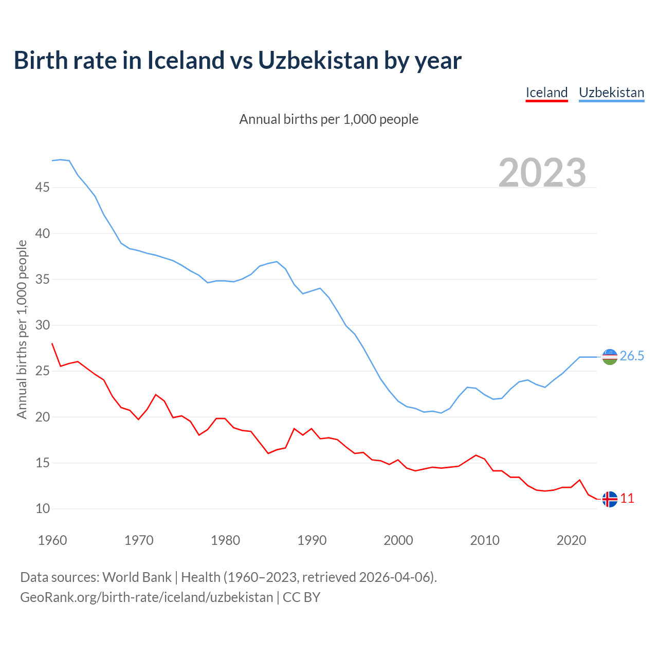 Iceland has an annual birth rate of 11 births per 1,000 people, compared to 26.5 for Uzbekistan. The average number of children a woman is expected to have during her lifetime — the fertility rate, is 1.59 in Iceland and 3.5 in Uzbekistan — 120.1% difference.