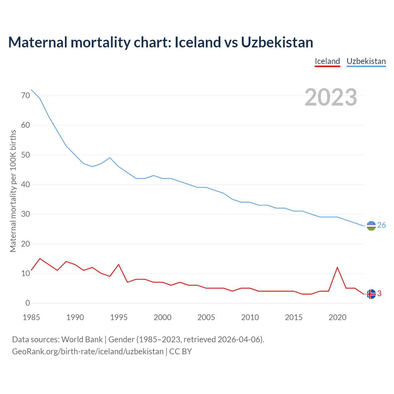 The maternal mortality rate, which is the probability of dying during childbirth or within 42 days of pregnancy termination, is 3 deaths per 100,000 live births in Iceland, compared to 26 deaths in Uzbekistan.