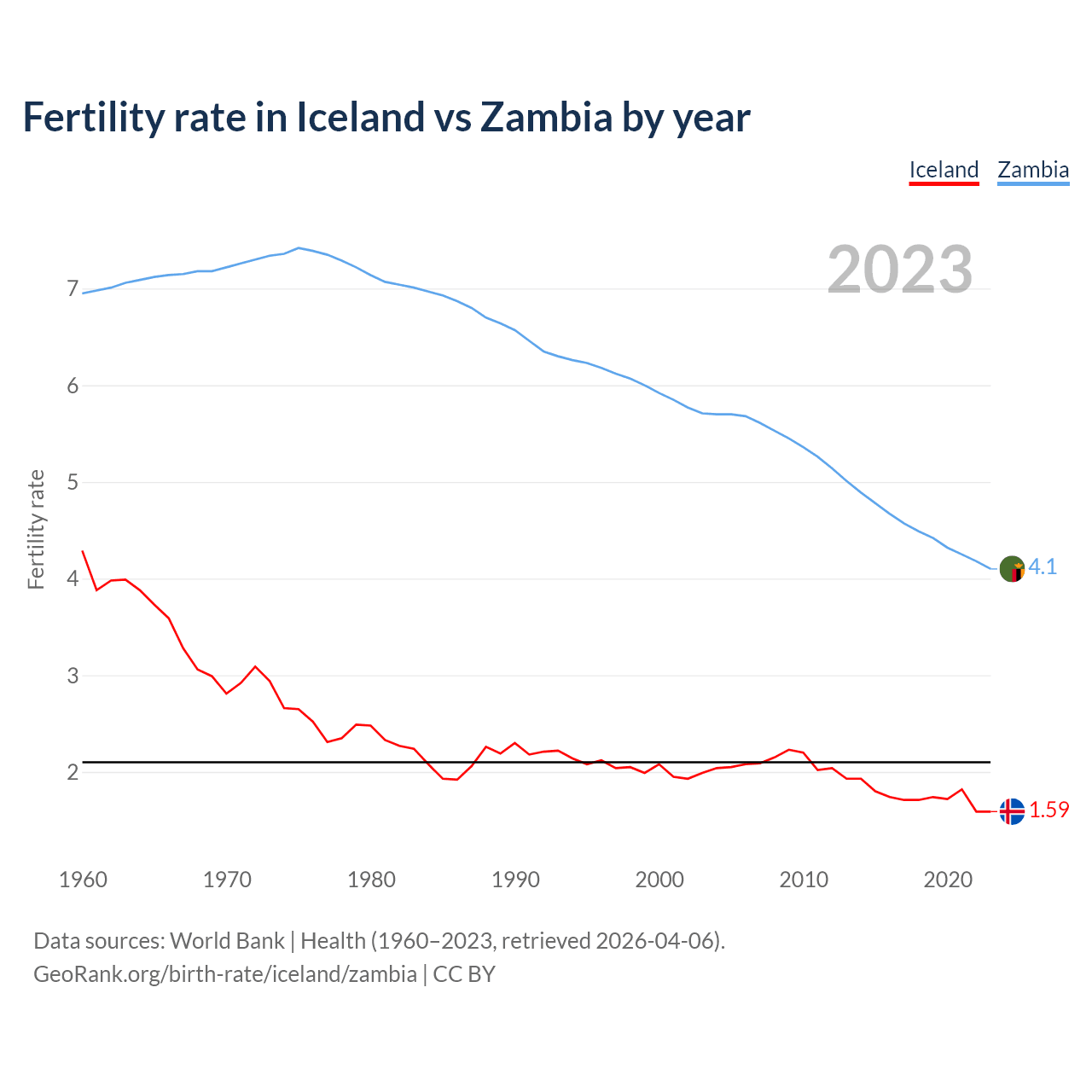 According to the latest available data on birth rates, the fertility rate in Iceland was 1.59 children per woman in 2023, compared to 4.1 in Zambia in 2023. The replacement level is considered to be 2.1 children per woman.